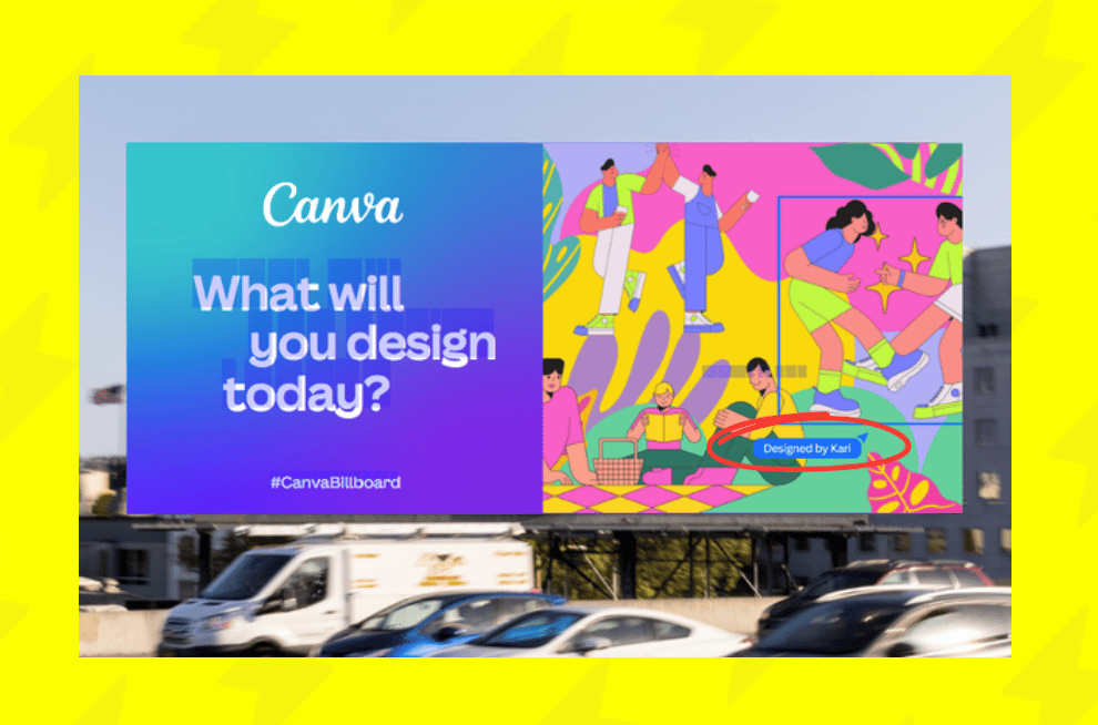 SaaS Show results from everyday users, not just pros Many people stay faaaar away from graphic design because their design skills stop at "stick figures." So Canva showcased billboard designs with credits like "Designed by Kari" on them—aka a regular user, not a pro.