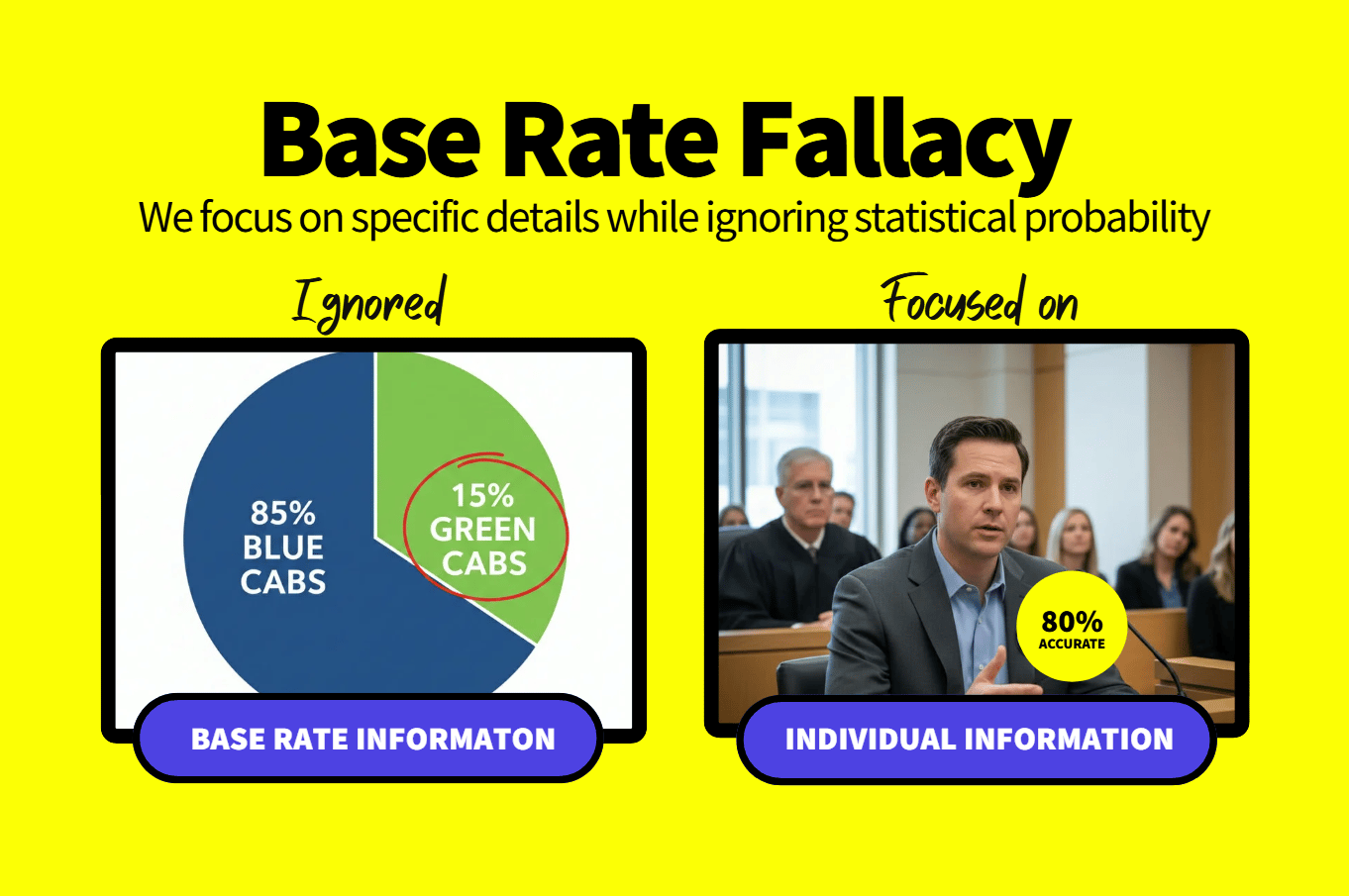 In a classic study, participants were told about a city with two cab companies: one has only blue cabs (representing 85% of all city cabs) and one has only green cabs (representing the remaining 15%). A cab caused a hit-and-run accident at night. And a witness, who identifies the right cab color 80% of the time, claimed the cab was green. So… what are the odds the cab was actually green? Most participants said around 80%, matching the witness's accuracy rate. But the correct answer was 41%. Participants ignored base rate information (only 15% of cabs are green) and instead focused on individuating information; that is, the specific details of the witness (80% accuracy rate).