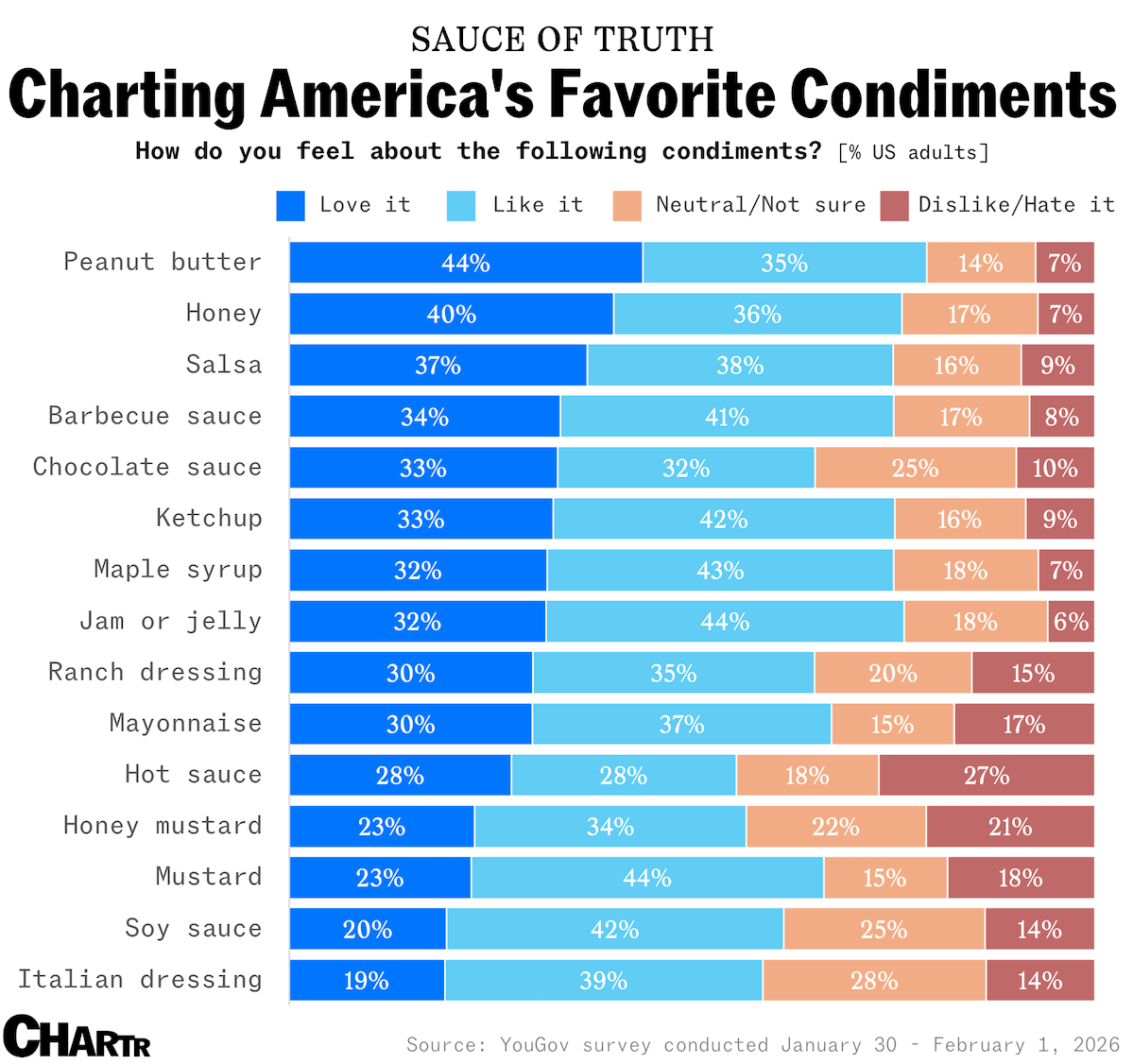 A new YouGov survey about condiments, conducted January 30 to February 1, reflects the strong feelings that Americans, besides those who are dynastic descendants, have about the spread. Indeed, 44% of US adults reported that they "love" peanut butter and a further 35% said they "like it," making it the top-rated condiment overall — before you say what we're all thinking, YouGov went out of its way to point out that it defined condiments "broadly" for the purposes of the survey. |