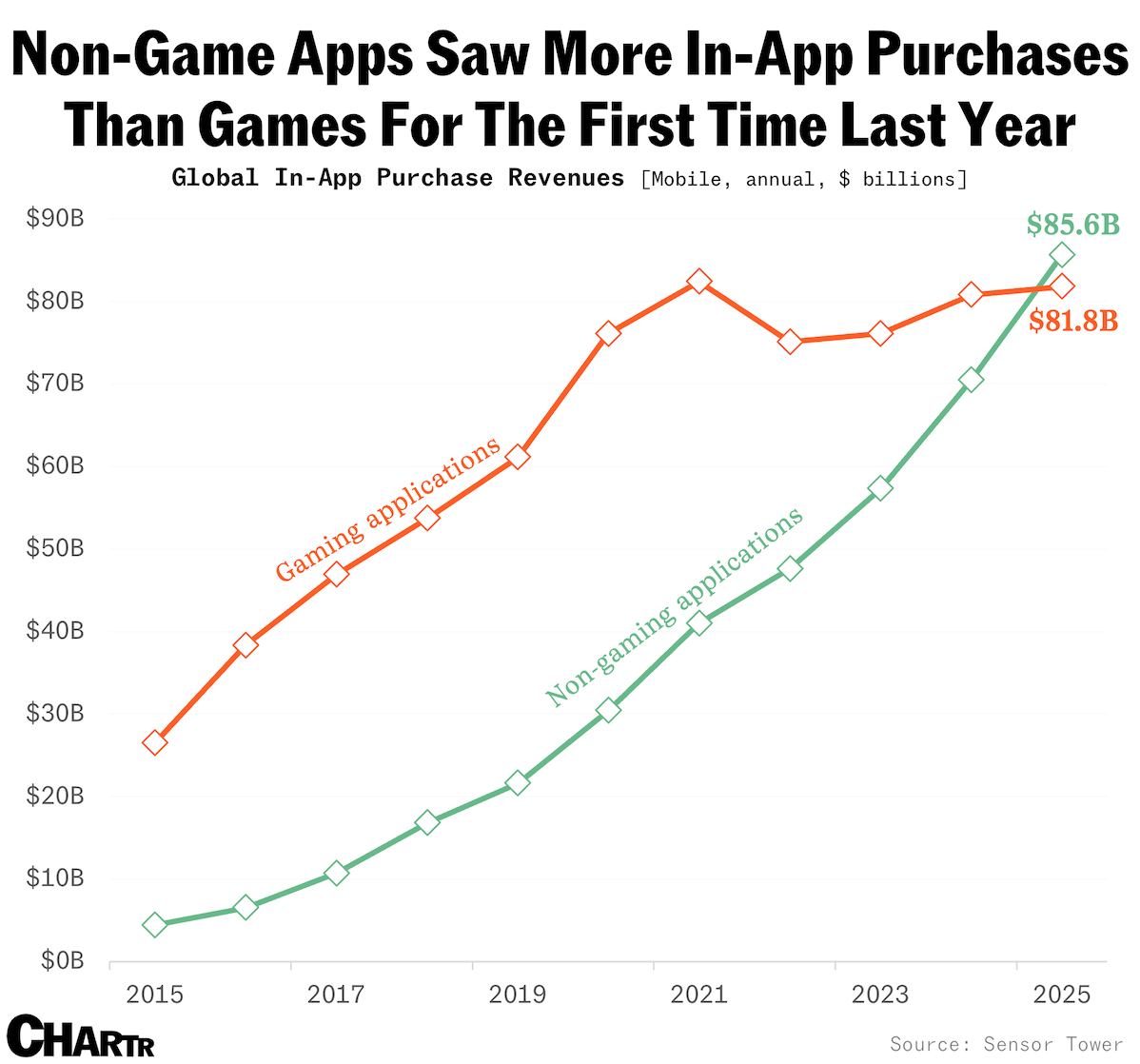 The mobile app industry has come a long way since early iPhone users would impress their friends by getting their phone out, tilting it at a 45 degree angle near their mouth, and polishing off a virtual pint of frothy beer in seconds on iBeer, an app that reportedly brought its developers $10,000 to $20,000 every day at its peak. While iBeer may have (understandably) fallen by the wayside in the years since, the business of buying time-consuming content to fill your phone's home screen and send the temperature of your device soaring has only gotten bigger, with users spending a record $167.4 billion on in-app purchases alone last year, per new Sensor Tower data. However, according to the same State of Mobile 2026 report, in-app purchases across non-gaming applications actually outweighed those made in games for the first time ever, suggesting that the things that many of us are using our mobiles for have shifted. |