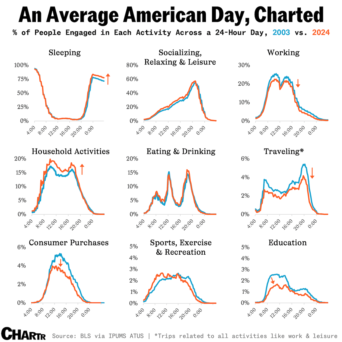According to the annual American Time Use Survey, Americans now spend about 30 more minutes sleeping per day than they did two decades ago, as well as spending roughly 11 more minutes on household activities. On the flip side, we're spending less time commuting, going shopping, and taking in-person classes — activities that usually have us interacting with others out in public. In 2003, the average American spent 7.7 hours per day at home; by 2024, that figure had risen 18% to 9.1 hours, with the pandemic only accelerating the climb. Time spent alone has followed a similar trajectory: nearly 7 hours a day in 2024, up from 5.8 hours in 2010. |