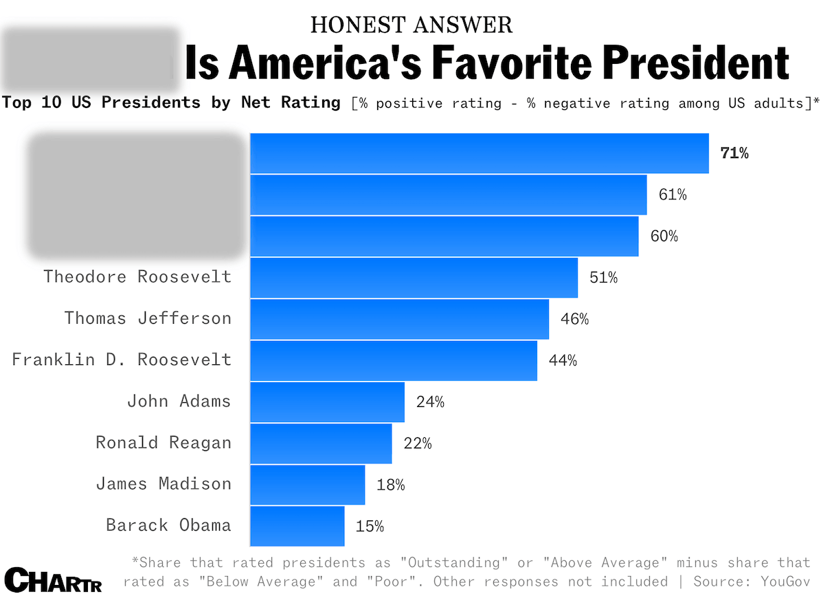 Off the charts: According to a recent YouGov survey ahead of Presidents' Day today, who are America's three favorite historical Commanders-in-Chief? [Answer below]. |