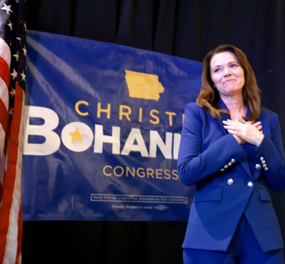 We first interviewed Chair Hart last summer. In this new discussion she gives us an update on a state where we have real opportunity this year - the incumbent Republican Governor, Kim Reynolds is the most unpopular in the country; Trump’s tariffs and mass deportation policies are doing enormous damage to Iowa’s farm economy; polling shows that both the Gubernatorial and Senate races are competitive in a +13 Trump state; 3 of the DCCC’s 44 targeted “districts in play” - districts we working to flip - are in Iowa (IA-1, IA-2, IA-3). With all these competitive races Iowa has become one of the most important battleground states in the county this cycle. What should make all of us optimistic about our opportunity in Iowa this year is their remarkable performances in six state legislative special elections so far. In these six specials our candidates overperformed 2024 by an average of 22 points (22 points!!!!), winning four races, flipping two state Senate seats to end the GOP supermajority, and electing the first Latina to the state House and Black woman to the State Senate. It’s arguably the best performance of any state party in the country this year in state legislative special elections. Your support of the Iowa Democratic Party (IDP) has helped us have a very encouraging cycle so far and is helping the IDP build out its most ambitious coordinated campaign and field operation in many, many years. Our early and significant investment - now almost $75,000 - has contributed to building out this ambitious operation, one that ensures that as some of our candidates emerge from June 2nd primaries they will be able to hit the ground running and not have to start from scratch. You can contribute to our Audacious Expansion Fund here, or if you prefer, consider contributing directly to Rita Hart and the IDP here. Iowa is one of those states we must target to have a shot at flipping the Senate this year. If we hold on to GA (Ossoff), MI, MN, and NH we start at 47 Senate seats. If we flip ME and NC (Cooper) we get to 49. To get to 51 we will need to win 2 of Alaska, Florida, Iowa, Ohio, Texas. Between our Audacious Expansion Fund and our Senate endorsements Hopium is currently raising and supporting Democratic efforts in all 7 of these expansion states - Alaska, Iowa, Florida, Maine, North Carolina, Ohio, and Texas. Our Senate map this year is a hard one, but not an impossible one; and it only becomes possible through these early, deeply strategic investments in state parties and candidates. Here’s our current field in these critical races in Iowa: