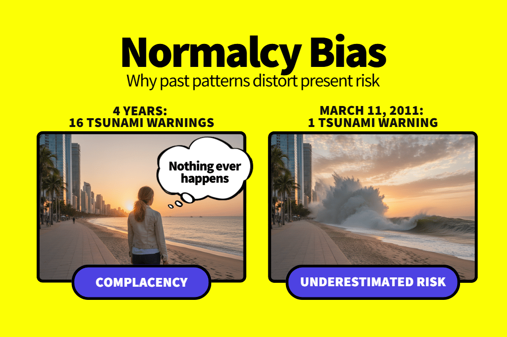 Normalcy Bias occurs even when warning signs are flashing right in front of us. We assume tomorrow will look like today in part because our brains rely on past patterns to predict the future. It's a mental shortcut that saves time and energy. But it can backfire when circumstances shift and warrant serious attention. In one study, researchers looked at disaster response behavior after the 2011 Tōhoku earthquake and tsunami in Japan. Despite multiple warnings, many people delayed evacuation or didn't evacuate at all. Why? One of the most common reasons was that they believed their location was "safe enough to withstand disaster." Other scientists found that 16 tsunami warnings had occurred in the four years prior that resulted in inconsequential tsunamis—and dangerous complacency.
