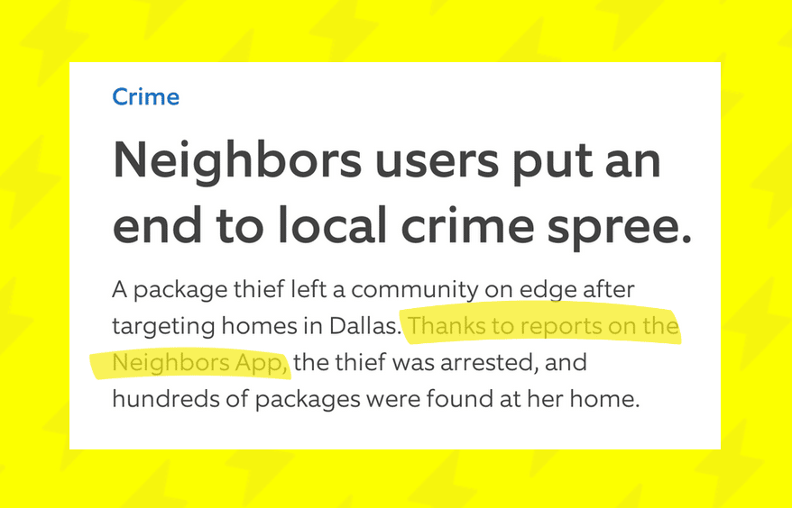 Apps Turn distant threats into real-time risks When neighborhoods are historically quiet, residents are more likely to leave the front door unlocked while cooking dinner, keep windows cracked on summer nights, or let Amazon packages sit on the porch all afternoon. But Ring's Neighbors app shows why that's not a good idea. Local users share real-time crime clips and updates from their actual street and too-close-for-comfort areas.