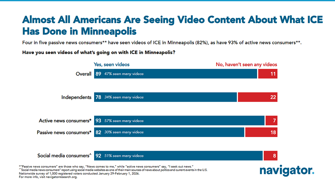 On ICE We Are Having The Fight We All Wanted To Have, And Now We Need To Win It (New Video, Written Analysis)The public is behind the big Democratic push to rein in ICE, and protect our fundamental rights and freedomsMorning all. I sat down with our paid subscribers last night for our weekly check-in about how we are doing in our fight for freedom and democracy, here and everywhere. A video recording is above and a full rough transcript is here. This was a lively and comprehensive conversation about this moment in our politics - get to it when you can. Leaders Schumer and Jeffries released a more detailed outline of the emerging Dem ICE reform package late last night: This is a very serious list of reforms, supported by every Democrat in both chambers. We are now having the fight over ICE we all wanted to have. We need to put our head down these few weeks and do everything we can to win it. In the last few days we’ve reviewed two very comprehensive polls about ICE and Trump’s reign of terror (YouGov, Navigator). Each showed how much the American people had turned against ICE and the regime, and how supportive they would be of an agenda like the Leaders have offered. Navigator released some new data this morning I want to dive into, for it confirms the big argument I’ve been making these last few days - that Democrats must attack the big lie that the regime is using to justify the dramatic escalation we are seeing - that the regime’s immigration strategy is the targeting and removal of criminal migrants. Look at this data. As we saw in the YouGov poll there simply is no support in the public for ICE’s targeting, detaining, and deporting law-abiding immigrants, legal or undocumented. In this question only 27% - 27%!!!! - said ICE should be removing all undocumented immigrants: As we will see in this data it is clear the American people are wildly opposed to any version of mass deportation that goes beyond deporting criminals. Look at this chart. The public is not just concerned about the violence. Americans are also extremely concerned that ICE is targeting people beyond Trump’s stated - and fictitious - goal of removing criminals: Now, let’s look at a fascinating question. Here even Non-MAGA Republicans support a “balanced approach towards immigration” over the current Trump-Vance-Miller approach by 58%-33%. The 41 point advantage of our approach here is greater than our advantages on health care and affordability in most polling now: And thus, not surprisingly, a majority are on board with the Congressional Dem approach to reining in ICE funding. The American people want change, though our margin dips when shutdown is introduced. So yes its why we need to be loud, as loud as we can be these next few weeks! There is also a lot of data in this new report about how significant citizen videos of the violence and killings have been to shaping public opinion about the terror regime. It suggests we should be making the training of Constitutional Observers across the country to challenge ICE a national priority of the pro-democracy movement (yes many such trainings are already underway): So, while I am generally pleased with where we are now, we should be working hard in the coming days to get our leaders to be more explicit about the need to roll back the $40b from the big ugly bill for the expansion of detention centers. These centers are only needed if the regime is allowed to execute its mass deportation plan, one that envisions deporting tens of millions of undocumented and legal immigrants over decades, and keeping the terror regime in our cities permanently. Simply, as we see in this data (and in the YouGov data too) the American people do not support these mass deportation ambitions. And as we discussed yesterday we must do everything we can to fight the detention centers - both their current inhumanity, and their expansion. This bullet from the Dem agenda is a good start. But it doesn’t go far enough: This kind of stuff described below must end. Now. For as we know from history where this goes if unchecked is only one place - dictatorship and the end of American democracy. We cannot allow a series of these gulags to be built. For they are unnecessary, and if they get built they will get filled by undocumented immigrants, legal immigrants, journalists like Don Lemon, political opponents of the regime, Democratic leaders, and eventually all of us. Now, Let’s Get To Work PeopleKeep contacting your Congressional Reps and demand they rein in ICE!!!!!!!!!!!!!!!! Big week ahead! Fired up about our big win in Texas Saturday night? Contribute to our Audacious Expansion Fund which has already poured $70,000 into the Texas Democratic Party to help fuel this victory; fund the Texas Dems directly; watch my recent discussion with Kendall Scudder, the dynamic new Chair of the Texas Democratic Party discussing their ambitious 2026 plans. Winning The Midterms - Support Our Candidates