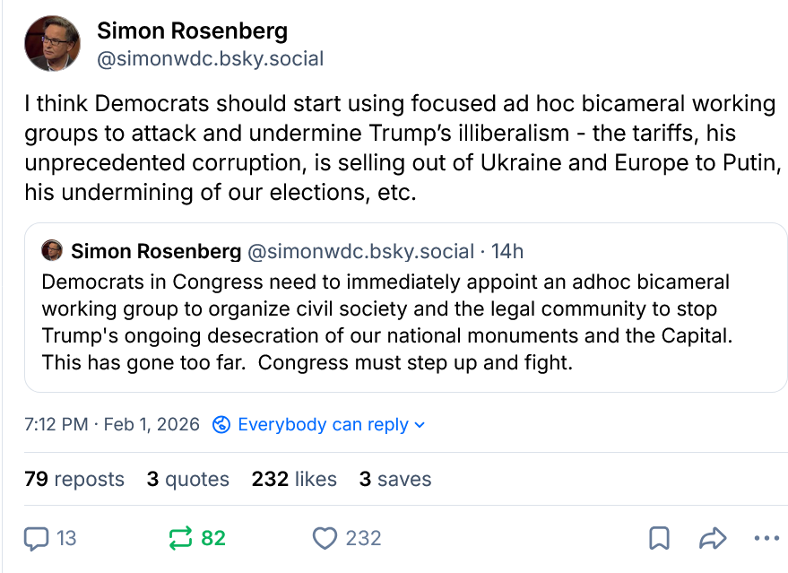For we are much stronger together than apart. Here’s an example of how we should be thinking now. Last night, incredibly, Trump announced an escalation in his ongoing desecration of national monuments and our Capital. He announced he was closing the Kennedy Center for two years and rebuilding it. Here is what I wrote on Bluesky: Leaders Schumer and Jeffries could create bicameral workings groups of a small number of members to more forcefully contest Trump’s outrageous flouting of the law and selling out of our interests across many fronts - the tariffs, his appeasement of Putin, his unprecedented corruption, his assault on the integrity of our elections, etc. We can use shadow hearings, daily statements, alliances with the states and even foreign nations to contest, degrade, expose and fight 24/7/365. The success of the Epstein project, driven by House Oversight Committee Ranking Member Robert Garcia, can be a model, as can his bicameral work on ICE’s abuses with Senator Blumenthal of Connecticut. One of these working groups should be focused on stopping his desecration of our national monuments, global symbols of democracy and the great American fight for freedom. For this isn’t about real estate, or rapaciousness, it is about a direct attack on the rule of law and powerful symbols of what Trump views as an ancien regime - America as a democracy, where rule of law still reigned. And like everything with Trump if we do not contest when he breaks laws he will view it as a permission structure to proceed, and will then proceed, escalate, and further accelerate democracy’s decline. His gilded ballroom should not be built. He should not destroy the Kennedy Center just a few years after it completed a massive renovation. He should not be able to seize three public golf courses in DC, including one adjacent to The Mall, or another parcel of land he is attempting to seize on The Mall itself. There are laws governing these matters and he should be forced to follow them. For we cannot accept any instance of lawlessness or lawbreaking - for when we do he reads it as a green light to keep going, and thus we become complicit in the crimes themselves. This thing we hear from DC insiders is that we must be practice “message discipline” and pivot back to kitchen table issues - and not contest things like the illegal seizing of a national monument to one of our Party’s most inspirational Presidents - has been wrong and ruinous counsel. It’s a misunderstanding of how autocrats work, and what’s required in new and unprecedented circumstances here in the US today. It is a “zombie” strategy that may have been relevant once but is no longer relevant or effective today. For as we’ve seen Trump continues to escalate, continues to do enormous damage to the nation and to our rights and liberties, and simply, my friends, we have not been fighting hard enough to stop the damage he is doing. For while we talk about affordability and health care he keeps executing against his primary mission - making himself a King not a President - uncontested. That’s why these next few weeks matter so much. In 2026 our leaders must find a higher gear, one that allows them to organize themselves differently to meet this moment, letting go of strategies and practices from a different time. It begins with this fight to rein in ICE, a necessary and consequential fight, and one we must be all in on every day until we do what is required now. So, today, tomorrow, and every day until we have new law - make your calls, contact your reps, call your governors - just make as much as noise as you can. Be loud and proud. Fight with everything you got, and let’s rein in ICE, together. For we are Americans for f-ck’s sake, and fighting for freedom and democracy is who we are, what we do. And we need to get on with it…… Now…… Yes, My Friends There Is Much We Must Do This Week!!!Keep contacting your Congressional reps and demand they rein in ICE!!!!!!!!!!!!!!!! Big week ahead! Fired up about our big win in Texas Saturday night? Contribute to our Audacious Expansion Fund which has already poured $70,000 into the Texas Democratic Party to help fuel this victory; fund the Texas Dems directly; watch my recent discussion with Kendall Scudder, the dynamic new Chair of the Texas Democratic Party discussing their ambitious 2026 plans. Winning The Midterms - Support Our Candidates
