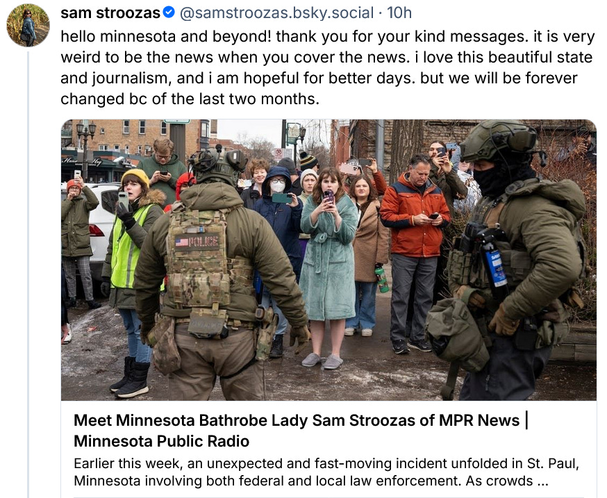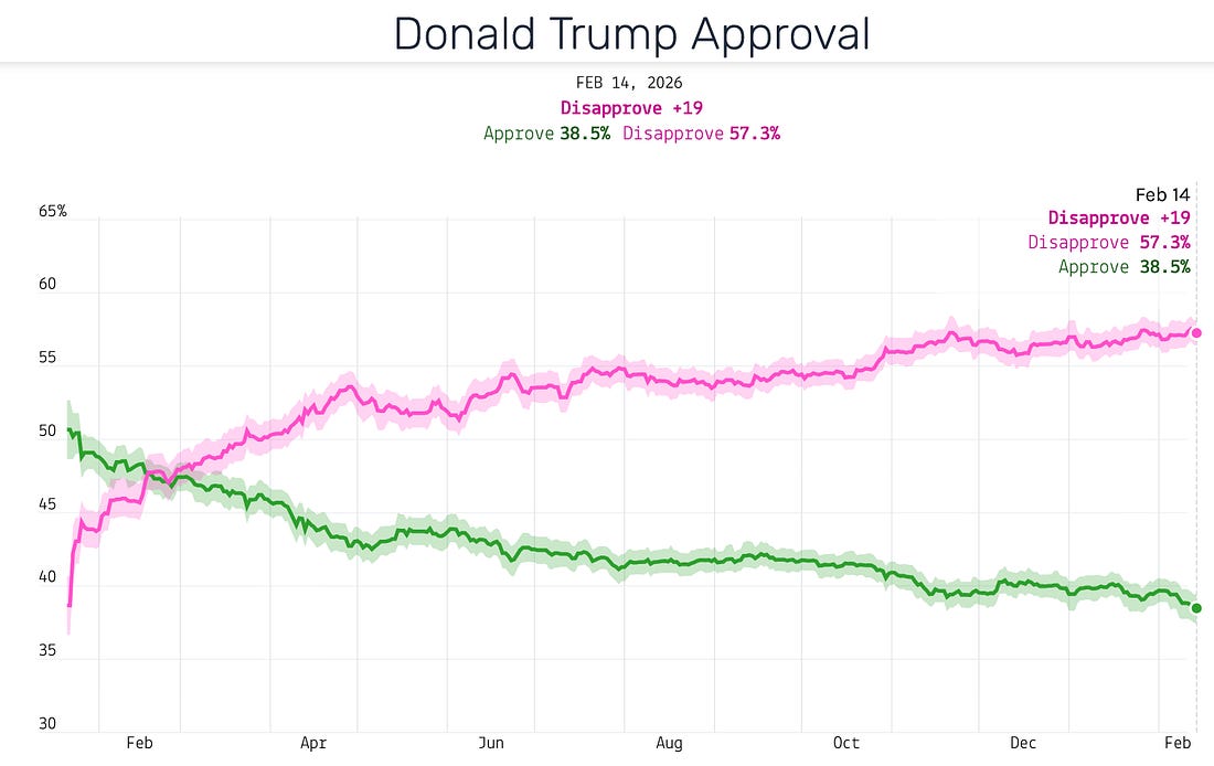 You can find all of our interviews and podcasts on the Hopium site under the Podcast tab, and on YouTube, Apple Podcasts and Spotify too. For your planning purposes you can now find the schedule of upcoming live and recorded conversations on our Events page. This week we will be joined by Rep. Delia Ramirez, Professor Phillips O’Brien, Alaska Senate candidate Mary Peltola and perhaps one more special guest. And a general reminder that if you “like” a post or video here it makes it more likely that the Substack algorithm will promote it, and that it will then be seen by a wider audience. So hitting like on our posts helps bring our work to more people, and helps grow the Hopium audience. I am also grateful for those of you who’ve been using our referral system to bring in more subscribers. Together we’ve been able to introduce Hopium to many new people in recent months. Yesterday we learned the name of the courageous Twin Cities “Bathrobe Lady” (and once again acknowledge the incredible inspiration that the people of Minnesota have been these last two months): The State of the Union (not at all good) will be Tuesday, February 24th, a week from Tuesday. We are going to need to be very, very loud that week my friends. Trump heads into this consequential period with his lowest job approval of his second term, his Congressional coalition fraying, DHS shuttered, his agenda roundly rejected by the American people, and a once proud nation just tired of the bluster and the bullshit, the incompetence and the corruption, the betrayal and the “more for me and less for all of you” agenda that is leaving us less prosperous, less safe, and less free…. There are two speeches members of our community keep talking about that I’m reposting for this long weekend in case you haven’t watched them yet…. The first is Senator Jon Ossoff’s powerful speech in Atlanta last weekend…. The second is Canadian Prime Minister’s Mark Carney’s Davos speech from a few weeks ago: Janet Mills just dropped a terrific new ad about Susan Collins and her “30 years of concern”: This week I began the process of rebooting my foundational With Democrats, Things Get Better presentation (last presented Aug, 2024) by updating some of its core graphs, ones that tell a very powerful story about American politics since the Cold War ended and a new age of globalization began: