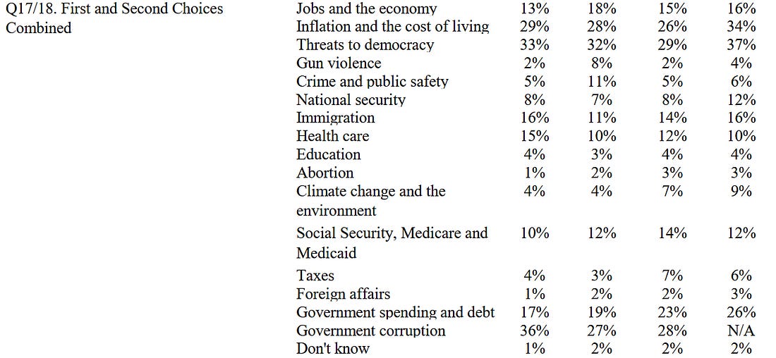 I’ve created a page to workshop our agenda. You can leave comments there, review earlier drafts of it for inspiration. In posting it today I realize there are parts that clearly need updating, things not yet in there that need to be. So help me improve it, and in the process spend time thinking about what you believe is most for us to do when we have power again. I agree with something many of you argue here - we must make clear not just what we are against, but what we are for; what will happen when we come back into power; what we will commit to do, not just say. Let’s do our part at creating a robust conversation now about who we are, what our agenda is, what we are fighting for. As we go forward there are two polling/message/narrative/framing areas that I think our family needs a big conversation about - strong and weak, and accepting that “threats to democracy” are things we need to be leaning into not pivoting away from. First, strong and weak. As regular Hopium readers know this is something we discuss frequently, for our issue heavy polling often does not go into brand attributes that are also important for how people come to form opinions about politics. I gave a talk about this need for us to become strong last week, Trump Is Weak, And Now We Must Become Strong. Here is a piece of what I said: