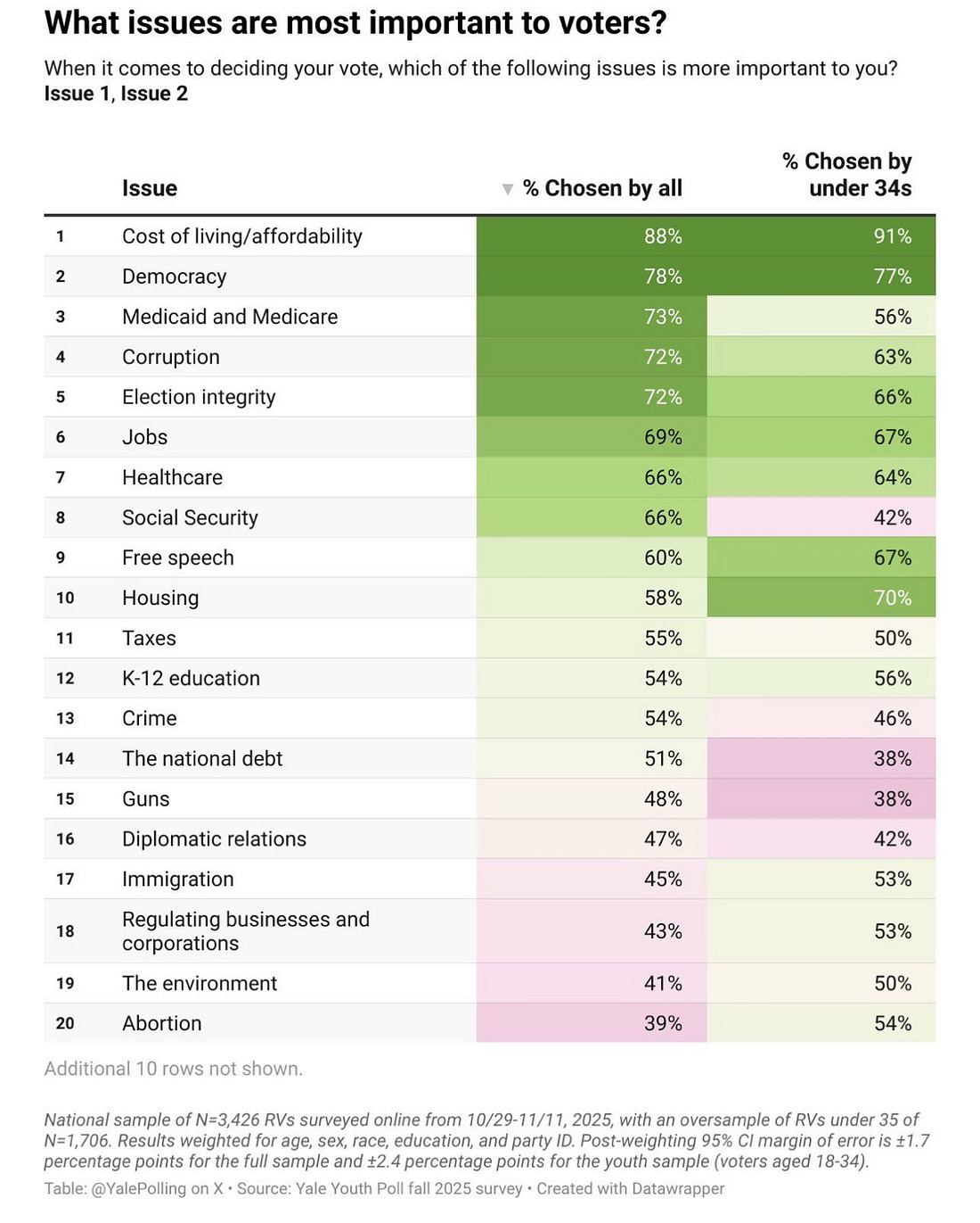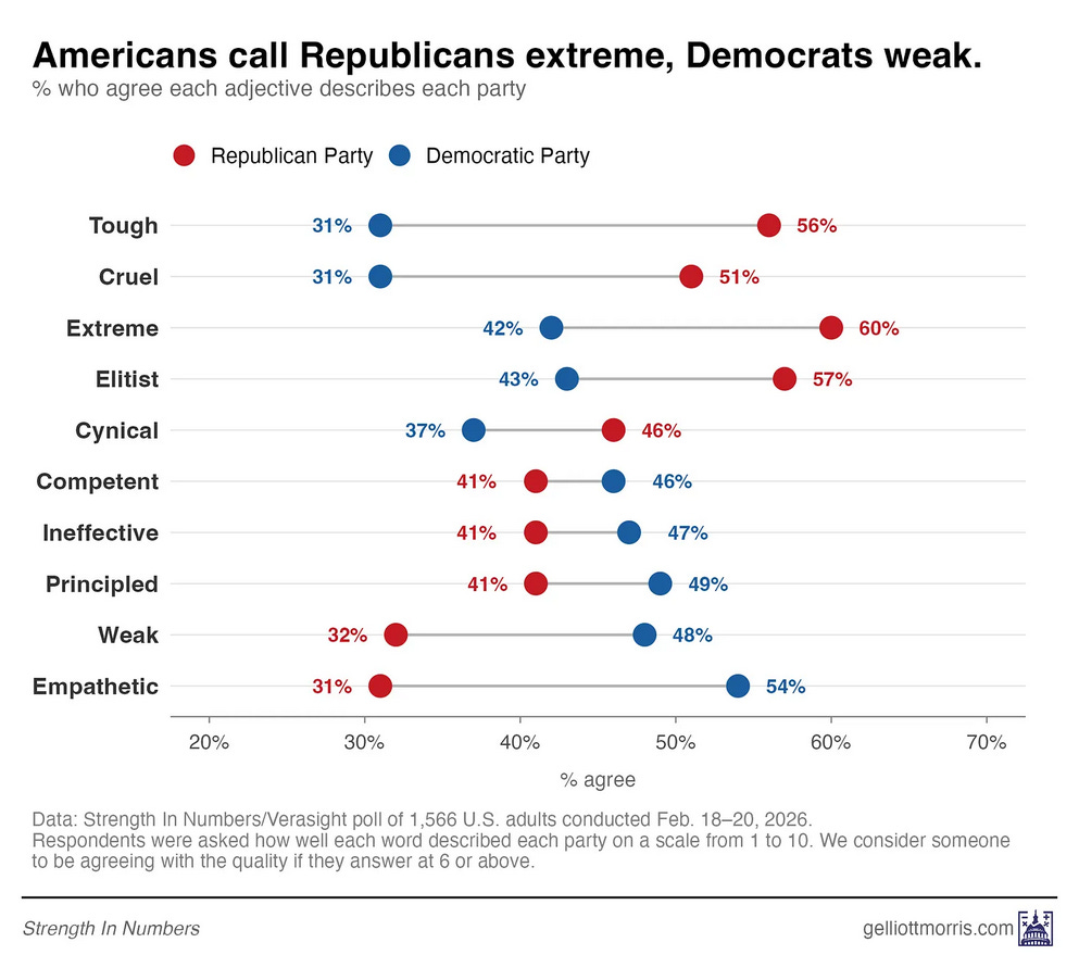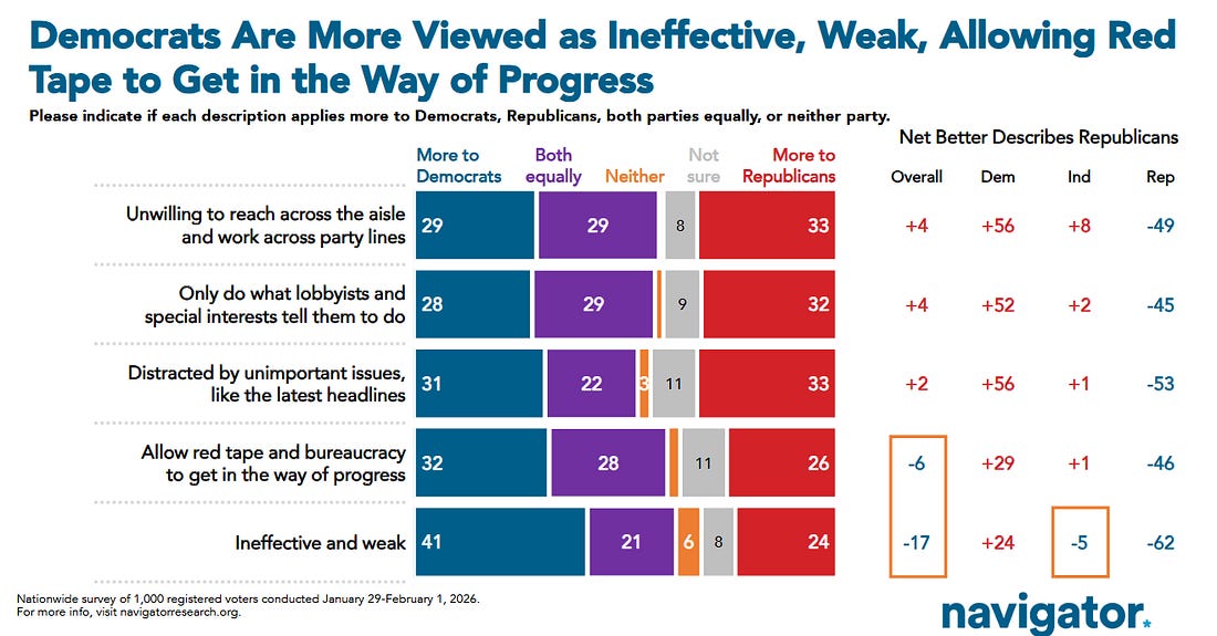In that post I showed this data from the 2024 Exit Polls that haunts me literally every day. People like Democrats, but we failed “strong enough to bring needed change” test in 2024: Recent Navigator polling confirmed that “weakness” is still a problem: And today, G. Elliott Morris has a terrific new piece on this, Democrats’ real problem isn’t being too liberal — it’s being seen as too weak, built around this new data from his polling: The second part we need to work through is this reticence to lean into “threats to democracy” or No Kings. Some of this is a hangover from 2024. But we need to be clear that there is a mountain of data, literally a mountain of data, showing that “threats to democracy” is both a top tier voting issue in the country right now and something helping motivate our voters. And thus we should be leaning into it, not pivoting from it. In December I went through the data available to us then in a post, In 2026 Democrats Can Be Both Warriors For Working People Against Oligarchy AND Proud Patriots Fighting For Democracy Here And Abroad, that showed that we should leaning into threats to democracy, as Governor Spanberger and Senator Padilla did so effectively on Tuesday night. Here are two examples from that post: Yale University Poll, December 2025: Here’s what a CNN poll taken right before the Election found: