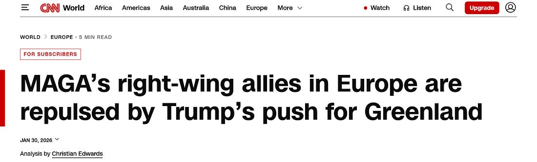 We’ve talked a lot about that interview here, and how it reminds me of a four year old standing on the top of a bunk bed telling his parents that he can fly, just watch……. For these words are the words of either a child or a madman. And it’s why I’ve been arguing that the fight ahead of us in the coming days is not just about reining in ICE. It’s about reining in Trump - getting him and his party to once again accept limits, to govern like leaders of history’s most important democracy, and fighting his descent into madness and our descent into tyranny. This NYT interview, and a similar one given by Stephen Miller on CNN that week, came in those heady days after Trump The MIGHTY and STRONG oversaw a midnight raid that seized Maduro in Caracas. In those heady and warm and lovely days Trump began his next adventure, a dramatic campaign to seize Greenland from the Europeans. And we know how that ended - Trumpian bluster was followed by Trumpian retreat as the Europeans banded together and demonstrated that indeed there were limits to his power other than his “own mind.” We are now in a similar confrontation, this one over his unleashing of ICE on a civilian population in the US, freeing them from law and limits and decency and just about everything else. In Minnesota DHS/ICE/CBP have been told to operate by Trump-Vance-Miller OUTSIDE of the law, without limits, for there is no law enforcement agency in any democracy, including ours, that trains their officers and agents to completely ignore federal, state, and local law. These 3,000 DHS agents in Minnesota were DIRECTED and ORDERED to operate outside the law in order to terrorize and subdue and punish and convey that in this new world of Trump 2026 THERE ARE NO LIMITS. I can seize GAZA; snatch Maduro in a daring midnight raid; vaporize USAID; levy wildly illegal and idiotic tariffs on any one, any time, depending on what I had for breakfast that day; steal America’s secrets and sell them to others; take unprecedented bribes from foreign actors and enrich myself and my family; jail journalists and other people who annoy me; continue to bury the Epstein files, illegally, to protect me and my many, many friends and senior aides who did unspeakable things to young girls in New York, Florida and on Epstein’s Island. For I AM MIGHTY, and STRONG, and THERE ARE NO LIMITS TO MY POWER he told us in that New York Times article. Except there are. The Europeans just showed that there are limits to his power. We’ve been showing that in election after election of all kinds across this country over the past year, including a state senate special election last night in Texas where our candidate was outspent by nearly 10 to 1 and won a +17 Trump district by 14 points…… We’ve seen the limits to his power in Congress’s diligent work to reclaim their power of the purse these past few months, powers unconstitutional usurped by Elon and Vought, by their passing 10 appropriations bills that will make it much harder for Trump to do and spend as he pleases. We’ve seen the limits to the regime’s power on the streets of Minnesota through the extraordinary and inspiring bravery of every day Americans. And we’ve seen the limits to his power in his concession/retreat/capitulation to Senate Dems this week in splitting off the DHS appropriations bills from those other 10 and creating what will be a real opportunity for us to rein in ICE, and establish limits not just on Trump and the regime, but on what may be both the single most cherished manifestation of his vision, and the most dangerous for all of us - the turning of ICE into a terror force unleashed against “invaders” and his political opponents. I don’t know what we are going to get in these negotiations over the next two weeks. We probably won’t get as much as we all want or need. We should expect that, and not allow what is about to happen to be about disappointment - for that would be a dramatic misread of what’s happening here. For what’s happened in recent days is something that needed to happen if our democracy and freedoms were to be preserved - Congressional Democrats have come to understand that the fight in front us is not just about affordability or restoring the ACA subsides it is about using all of the collective power of the Democratic Party, the courts, free states and cities and towns, to put limits on our out of control and dangerous leader. For simply, he is escalating, and becoming more dangerous; the decline of our democracy and rule of law is accelerating; and thus we must act with far greater urgency to use all the power available to us - as the Europeans did - to rein in not just ICE but Trump and the regime itself. So we will get as much as we can in the coming days, take the win, and build on it to go get more. Looking back at the past year our leaders have accepted too much without mounting a muscular enough challenge. We never should have accepted the vaporization of USAID and the killing of 15 million of the poorest people on Earth; his unprecedented and in your face corruption; of Witkoff and Kushner selling out Urkaine, Europe and the West to Russia; of the sending of innocents to a foreign gulag; of these wildly illegal and destructive tariffs; the list goes on and on. Our leaders should have fought each of these illiberal and destructive acts with the same courage, grit, and patriotism as we’ve seen from the people of Minnesota. But it did not happen. And incredible damage has been done. That’s why this fight to rein in ICE over these next few weeks is so important. Our leaders, the collective leaders of the pro-democracy movement here in the US, must learn to how to fight, every day, with the same resolve, bravery, and strategic intent as the people on the streets in Minneapolis; as the lawyers fighting to return 5 year olds kidnapped from their families; as the protestors gunned down last month in Tehran; as the families freezing 