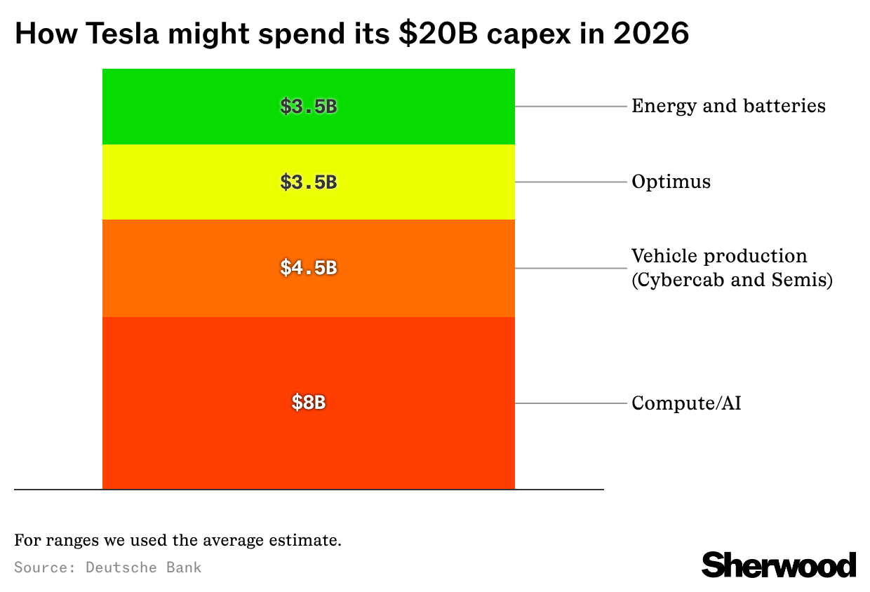 - Tesla's going to outlay over $20 billion, specifically on "six factories, namely the refinery, LFP factories, Cybercab, Semi, a new Megafactory, the Optimus factory." According to Deutsche Bank, about $8 billion is going to compute, $4.5 billion to vehicles, $3.5 billion to Optimus, and $3.5 billion for batteries and energy.