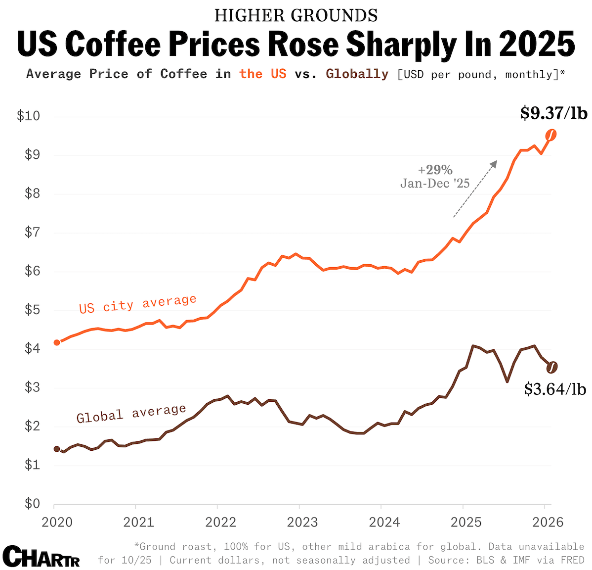 According to Friday data from the BLS, the average price of coffee across US cities went up to $9.37 per pound in January — the most expensive since records began in 1980, and up 33% from January 2025. Meanwhile, the global price of coffee dropped to $3.64 per pound last month. |