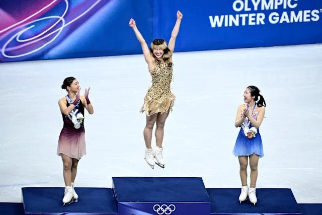 The State of the Union is this week and I am planning on being very active and visible. You can get the details and links on our newly revamped Events page, but tomorrow I will be joining Allison Gill for her weekly Sunday MeidasTouch program; on Tuesday I will be joining Mike Nellis for his Endless Urgency live show; on Wednesday I’ll be joining Katie Phang for a live post SOTU recap, and our paid subscribers will gather at our usual time that night at 7pm EST. And I am sure I’ll be adding a few more interviews with leaders making things happen for all of us. We had a really good week everyone. It was full of Trumpian retreat, failure, repudiation. Let’s close today with my favorite photo of the week - inspiring gold medal winner Alysu Liu celebrating her remarkable win. Perhaps we can all do a joyful jump like that this weekend……. Now, Let’s Get To Work People!!!!!!!!!!!!!!!!!!!!!!!!!!!!!!!!!Winning The Midterms, Competing In Red States and Red Places, Expanding The MapHopium’s Winning The House Campaign (2026) - $172,500 raised, $250,000 goal (new stretch goal) - Donate to all four endorsed House challengers with one click | Learn More | Enjoy our new conversations with Christina Bohannan (IA-01), Mayor Paige Cognetti (PA-08), Jo Mendoza (AZ-06), and Janelle Stelson (PA-10). Now including funds already raised with our friends at FridayAction for a joint event we are doing in late March. Hopium’s Audacious Expansion Fund - $376,400 raised, $500,000 goal (new stretch goal) - Join our new campaign to expand our map by investing in the Democratic Parties of Alaska, Florida, Iowa, Maine, and Texas. Many thanks to two generous Hopium community members who have audaciously donated $10,000 to each of our five state parties. Mary Peltola For Alaska Senate - $36,400 raised, $250,000 goal - Donate | Volunteer and learn more. Amazing start everyone! Winning Ohio - $60,900 raised, $250,000 goal - Our new campaign splits contributions evenly among Sherrod Brown, the Acton/Pepper ticket, and the Ohio Democratic Party. Donate today and help us turn this critical 2026 battleground blue! | Watch my conversation with David Pepper, who does a great overview of the opportunities we have in Ohio this year. Note a generous donor has sent $21,000 worth of Hopium-infused contributions directly to the candidates which are not included in our on-line goal tracker. Roy Cooper for NC Senate (2026) - $78,600 raised, $250,000 goal - Donate | Learn More | Volunteer | Enjoy my conversation with Gov. Cooper and a new, terrific one with NC Dem Party Chair Anderson Clayton Jon Ossoff GA Senate (2026) - $130,600 raised, $250,000 goal - Donate | Learn More | Volunteer | Enjoy my inspiring conversation with Senator Ossoff Winning The Big Arguments With Trump, Defend Our Democracy1 - Call Your Senators and Member Of The House And Demand They Act Upon Our Five-Part Agenda - We need to be loud people, very, very loud and make the case for our now five part agenda: