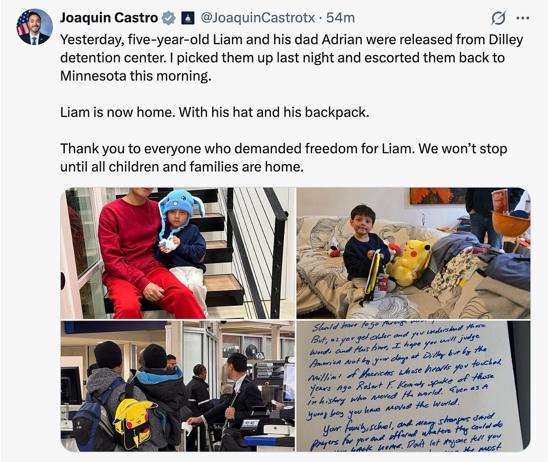 For Haitian families, TPS began as an emergency escape in response to the devastating 2010 earthquake. As we’ve been discussing, the administration has tried to revoke their temporary protected status (TPS), which is now set to end on Tuesday, February 3. DHS’s website notes, “After consulting with interagency partners, Secretary Noem concluded that Haiti no longer meets the statutory requirements for TPS. This decision was based on a review conducted by U.S. Citizenship and Immigration Services, input from relevant U.S. government agencies, and an analysis indicating that allowing Haitian nationals to remain temporarily in the United States is inconsistent with U.S. national interests.” There are cases moving through the courts that could disallow the arbitrary termination, but the Supreme Court muddied the waters in an earlier decision off of the Shadow Docket that permitted some deportations to proceed. DHS’s website now admonishes, “If you are an alien who is currently a beneficiary of TPS for Haiti, you should prepare to depart if you have no other lawful basis for remaining in the United States.” The loss of that status will make Haitians, and others, easy targets for the administration’s deportation efforts. But as we head into this new week, there is also some good news, and a judicial opinion that will make you smile. Released! The Judge’s opinion begins like this: “Before the Court is the petition of asylum seeker Adrian Conejo Arias and his five-year-old son for protection of the Great Writ of habeas corpus. They seek nothing more than some modicum of due process and the rule of law.” He explains, “The case has its genesis in the ill-conceived and incompetently-implemented government pursuit of daily deportation quotas, apparently even if it requires traumatizing children. This Court and others regularly send undocumented people to prison and orders them deported but do so by proper legal procedures.” With that, five-year-old Liam, who won our hearts with his blue bunny ears hat and Spider-Man backpack, was released from immigration detention. He should never have been detained—he and his father were in asylum proceedings, which gives them protection from deportation until their rights are determined. Liam is just five. The heartless way he was treated by ICE and CBP is far too reminiscent of how Nazis treated children. The reality is, there are a lot of Liams out there, and their parents, too. We don’t know all of them by name, but it’s certain their stories are every bit as gut-wrenching. Due process denied so DHS can make its quotas. The people who set them, Donald Trump, Kristi Noem, Stephen Miller, and others need to be stopped before it gets even worse. It’s past time for Congress to step up. There is now reporting of a measles outbreak in the detention facility. The Judge’s opinion is unusual. In just three pages, he schools the government and educates the public. Trump and his cronies will surely criticize the Judge, Fred Biery, in the Western District of Texas as just another activist leftist judge. He is, after all, a Clinton appointee. But Judge Biery, who was born in McAllen, Texas, went to Texas Lutheran College, then Southern Methodist University for his law degree, and served in the Army reserves in the 1970s. He has been on the bench for more than thirty years. Judge Biery has entered other opinions that have drawn attention for their eccentricity. This one is worth a thorough read. “Apparent also is the government's ignorance of an American historical document called the Declaration of Independence. Thirty-three-year-old Thomas Jefferson enumerated grievances against a would-be authoritarian king over our nascent nation. Among others were: 1. ‘He has sent hither Swarms of Officers to harass our People.’ 2. ‘He has excited domestic Insurrection among us.’ 3. ‘For quartering large Bodies of Armed Troops among us.’ 4. ‘He has kept among us, in Times of Peace, Standing Armies without the consent of our Legislatures.’ ‘We the people’ are hearing echoes of that history. And then there is that pesky inconvenience called the Fourth Amendment: The right of the people to be secure in their persons, houses, papers, and effects, against unreasonable searches and seizures, shall not be violated, and no Warrants shall issue, but upon probable cause, supported by Oath or affirmation, and particularly describing the place to be searched, and persons or things to be seized. U.S. CONST. amend. IV.” “Civics lesson to the government,” Judge Biery continues. “Administrative warrants issued by the executive branch to itself do not pass probable cause muster. That is called the fox guarding the henhouse. The Constitution requires an independent judicial officer.” He closes like this: “Philadelphia, September 17, 1787: ‘Well, Dr. Franklin, what do we have? ‘A republic, if you can keep it.’ With a judicial finger in the constitutional dike,” Father and son may still be deported if they don’t receive asylum, as Judge Biery acknowledges. But he has ruled the right way according to our laws and called out the government for doing the wrong thing, in colorful language designed to attract attention. In a moment where standing up for what is right is not always easy, federal district court judges are doing their fair share of the heavy lifting. As we head into the new week, Trump will continue to try to persuade us, with the use of brute force, that his overall success is inevitable. The Supreme Court has said he can commit no crimes as president. His administration has quite literally gotten away with murder, at least so far, on the streets of Minneapolis. Who can stop him now? We can. Those of you who have read my book, Giving Up Is Unforgivable: A Manual For Keeping A Democracy, know that I argue this aura of inevitability Trump projects is a hallmark of wannabe strong men, an effort to convince people they w