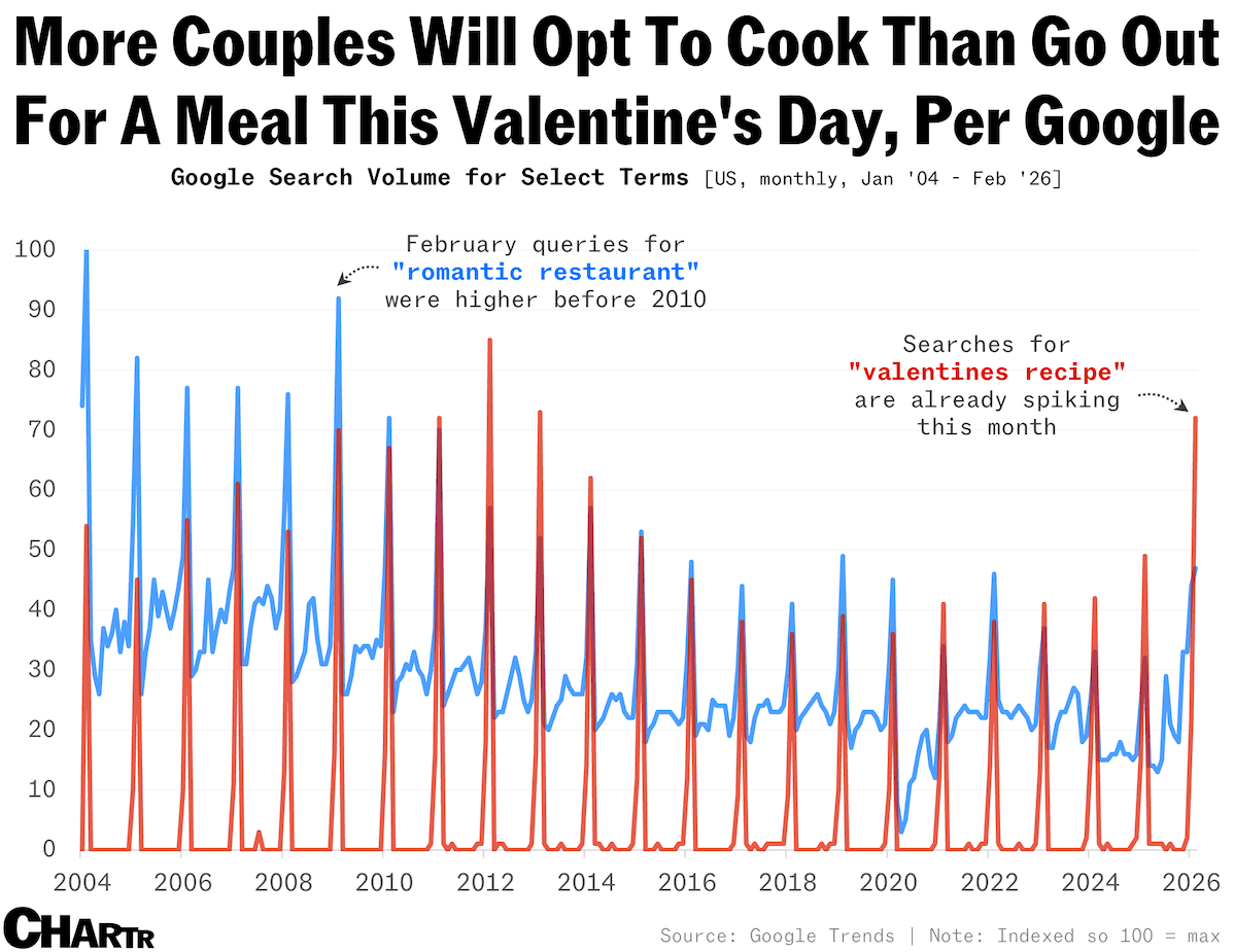 According to analysis from The Century Foundation, the price of Valentine's staples are up more than 15% on average in 2026 compared to last year, with heart-shaped candies up 8%, rose bouquets rising 16%, and a box of assorted chocolates up a jaw-dropping 27%. Per the report, those dining out with their dates can expect to spend over $200, as restaurant prices have risen at nearly twice the rate of grocery prices in the past year — maybe that's why Google search volumes for "valentines recipe" have surged past queries for "romantic restaurant" so far this month. |