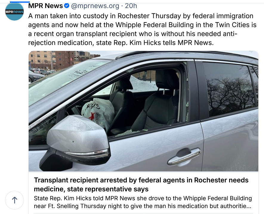 The US government is committing staggering levels of abuse, daily. The depravity and inhumanity is overwhelming. Breaking car windows. Ramming cars. Damaging property. No family visits or communication. Taking people out of Minnesota to Texas with no due process. Just gone. Requirement of a note from a doctor to take life saving medications even though the medicine was delivered the facility, creating dangerous delays. The lack of clear information, the uncertainty. A local elected official having to take the time to make sure her constituent doesn’t die. This is just one story. There are many like this every day. It’s why we must rein in ICE. End the violence and the lawlessness. Narrow their targets, stay focused on criminals, and make them leave the rest of us alone. We need to keep fighting.