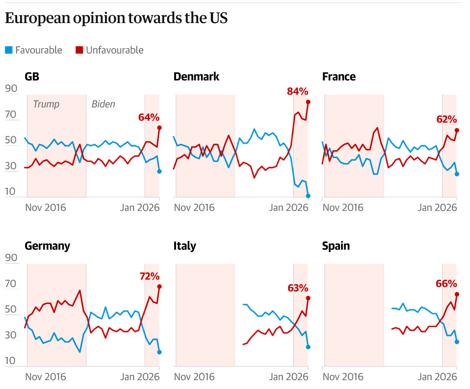 Trump’s embrace of Putin and attempted seizure of Greenland has turned European public opinion sharply against the US. From The Guardian:
