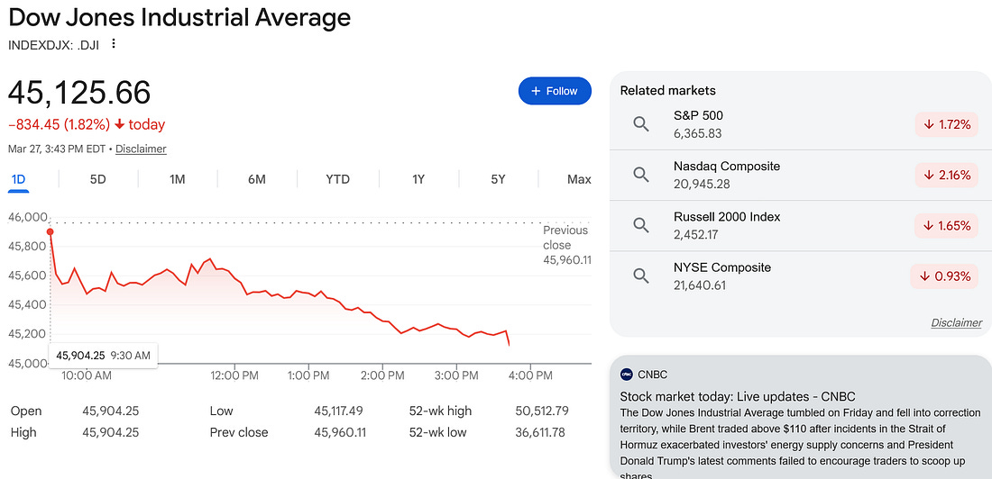 Fridays have been the worst day for the S&P 500 since the war began. Your Evening Briefing March 27, 2026 Stocks tumble with Nasdaq 100 ...