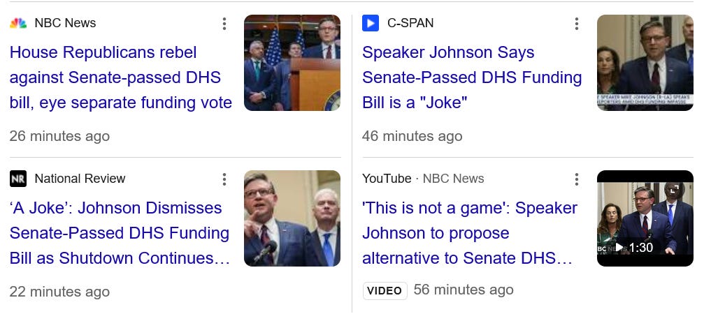 Breaking: House Republicans Reject Senate DHS Funding Bill, Johnson Calls It "A Joke"Under the weight of its many failures the regime has begun to splinter and come apart......Afternoon all. Big news. House Republicans have rejected the bi-partisan Senate bill to fund DHS minus ICE and CBP. Here’s a fresh account from The Hill: