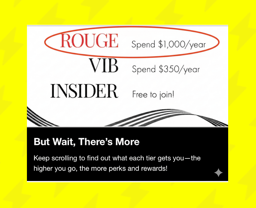 Loyalty programs Create irresistible status tiers that customers go out of their way to maintain Sephora's Beauty Insider program has three spending tiers: Insider (free), VIB ($350/year), and Rouge ($1,000/year). Each level unlocks better perks, like early sale access and exclusive birthday gifts. After you hit a certain tier for a few years, it's harder to scale back—even if you don't technically need another mascara yet.