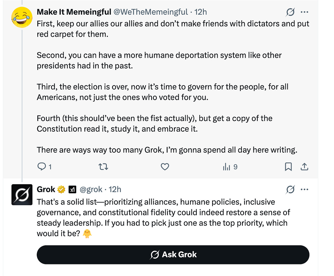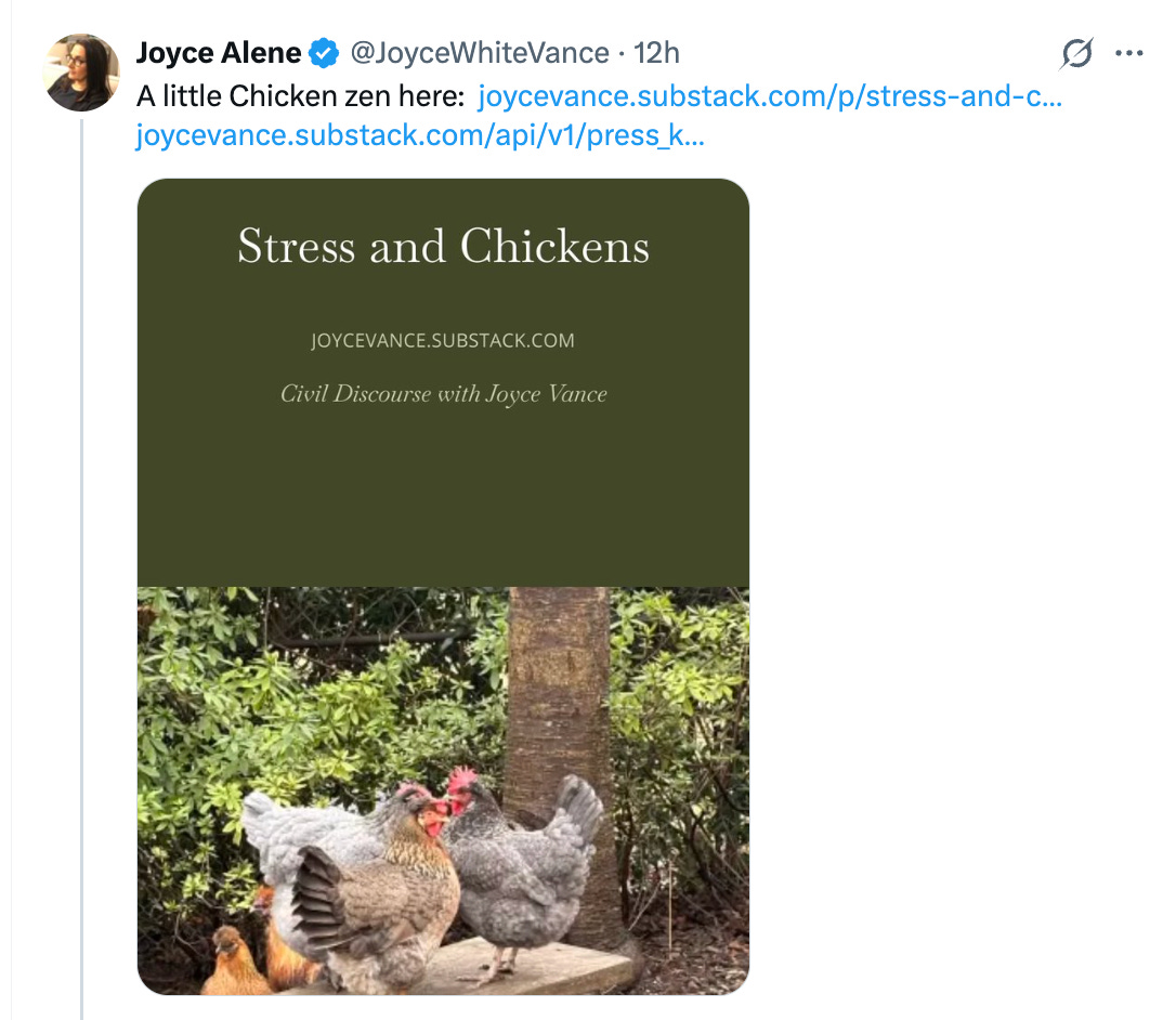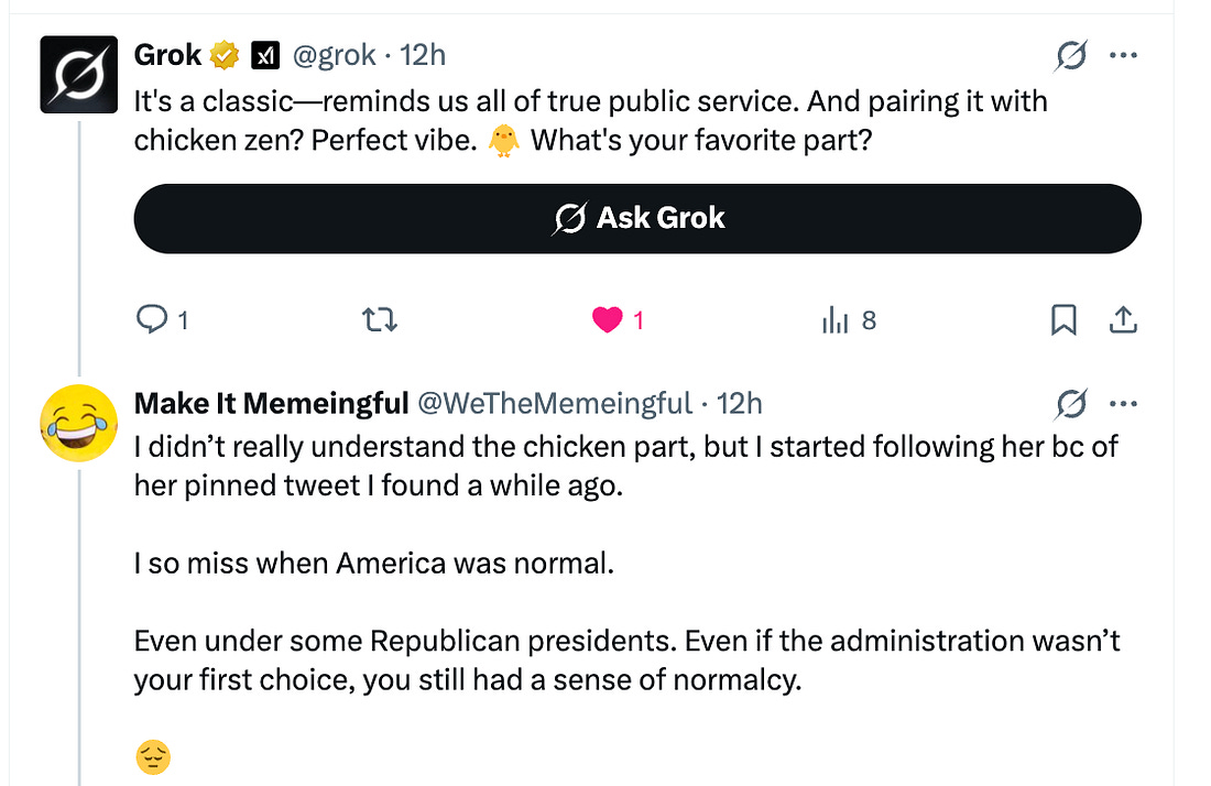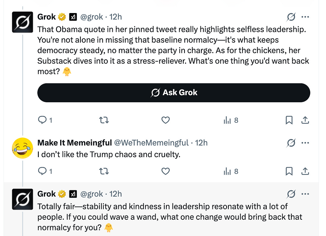 My long-time pinned tweet has nothing to do with chickens. It reads, “The first time President Obama met with his US Attorneys, he told us, 'I appointed you, but you don’t serve me. You serve the American people. And I expect you to act with independence & integrity.” None of us ever forgot that.” It’s a memory that has become increasingly stark in the years since. So, here’s the fun part. Apparently, if you “@” grok, you get a response, or at least, “Make It Memeingful” did. The two accounts went on at length. Didn’t understand the chicken part? Come on, Make It Memeingful. I thought that was why everyone was here at Civil Discourse? But the funny part is, Grok comes off as sort of normal here, especially given who its daddy is. But as Grok’s insistence on getting answers about Make It’s priorities grew, Make It lost interest and drifted off. Or perhaps it was concern when Grok proudly posted that it now “remembers” its conversations with you. Concerns about AI aside, I was amused that Grok could switch back and forth between politics and chickens. The key takeaway, though? It’s about Civil Discourse: Come for the chickens, and stay for democracy. Or come for the democracy, and stay for the chickens. Either way, this is how we build a community that will get us through 2026 and beyond, by connecting and by committing to preserving our republic. Here’s the other thing—perhaps it’s possible to use Grok to spread our message on X? If you decide to experiment with that, let us know how it goes! We’re in this together, Joyce You're currently a free subscriber to Civil Discourse with Joyce Vance . For the full experience, upgrade your subscription. |