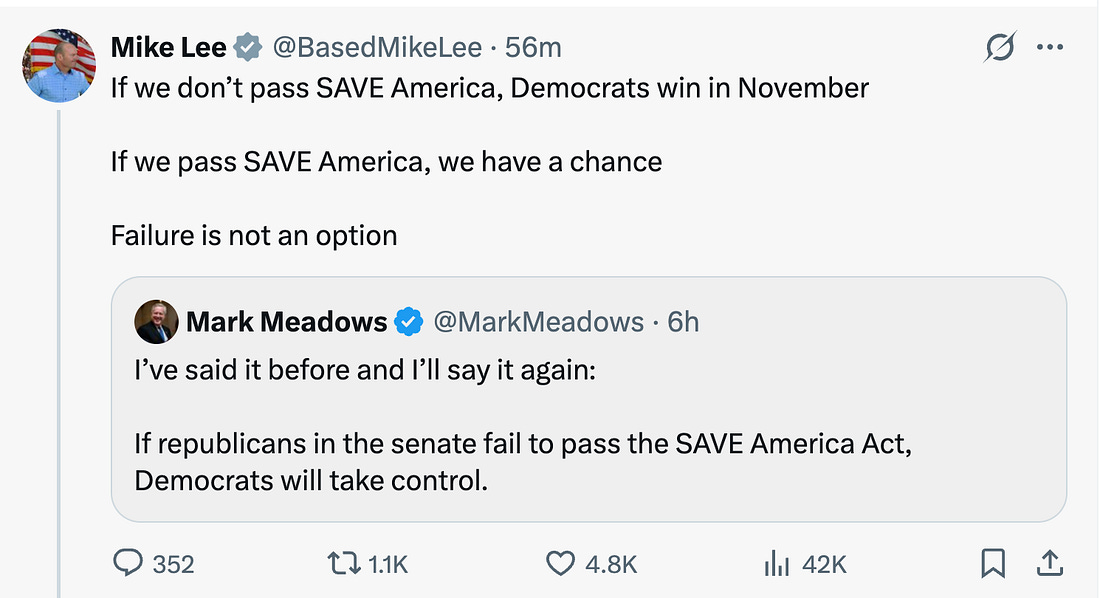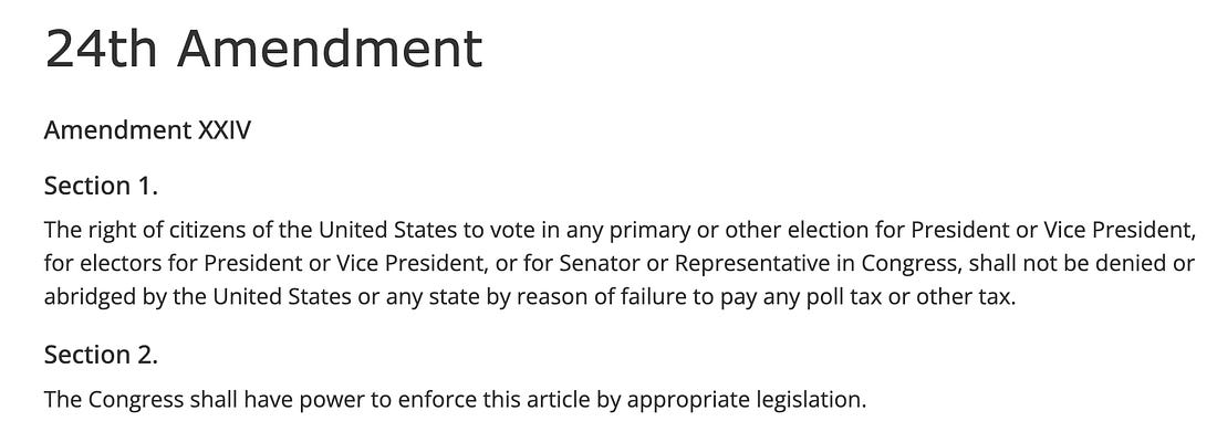 The End of the Poll TaxAnd, mark your calendars: Substack Live with Andrew Weissmann, Wednesday morning at 9am ETFirst, a quick note: Tomorrow morning at 9 am. ET, my former DOJ colleague Andrew Weissman and I will be together with you for a Substack Live. Bring your coffee, and of course, there will be video afterwards for the folks on the West Coast. Now, on to poll taxes. Today marks the 60th anniversary of the official demise of the poll tax at the hands of the Supreme Court of the United States. On March 24, 1966, the Court banned their use in state and local elections in Harper v. Virginia Bd. of Elections. The Court held that “wealth or fee paying has . . . no relation to voting qualifications; the right to vote is too precious, too fundamental to be so burdened or conditioned.” Harper was necessary because there was a loophole in the 24th Amendment, which had been ratified two years earlier. The Amendment abolished poll taxes in federal elections, but failed to address state and local ones. The Court slammed the door shut on any notion that states could discriminate against voters’ fundamental rights when the federal government was forbidden to do so. “Undoubtedly, the right of suffrage is a fundamental matter in a free and democratic society. Especially since the right to exercise the franchise in a free and unimpaired manner is preservative of other basic civil and political rights, any alleged infringement of the right of citizens to vote must be carefully and meticulously scrutinized." Today’s Harper anniversary is ironic, with Donald Trump pushing the SAVE Act and Senate Republicans considering it, although it seems to be foundering. The Act, which would require voters to prove they are citizens, functions like a poll tax. Voters would need passports or other forms of identification that are expensive to obtain in order to exercise their right to vote. Additional costs would be borne by certain voters, like married women, whose current name doesn’t match the one on their birth certificate. It’s clear Republicans understand what the SAVE Act is about: it’s not preventing non-citizens from voting, because that’s not a real problem. It’s about maintaining Republican control despite what the voters want. Harper: “To introduce wealth or payment of a fee as a measure of a voter's qualifications is to introduce a capricious or irrelevant factor. The degree of the discrimination is irrelevant. In this context -- that is, as a condition of obtaining a ballot -- the requirement of fee paying causes an "invidious" discrimination…that runs afoul of the Equal Protection Clause.” Today, Democracy Docket reported that Texas Republican Chip Roy, one of the leading proponents of the SAVE Act in the House of Representatives, and someone who has repeatedly dismissed “concerns that millions of Americans would face unnecessary barriers while registering to vote if the draconian bill became law,” took a different view in private. In a video obtained by independent media organization Call to Activism, Roy discusses how difficult it was for one of his employees, a woman, to obtain the identification she needed to get a REAL ID, which is similar to what the SAVE Act requires. In the recording, Roy says, “So, she had to go through a bunch of hoops. She’s gonna have to go back to the DMV twice because they want the paperwork. That’s just part of the issue with how we try to set up the ability to identify people.” This March 13 exchange between Senators Cornyn and Durbin is illustrative: