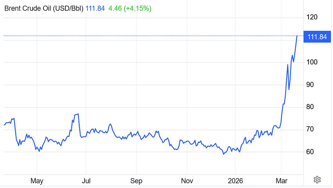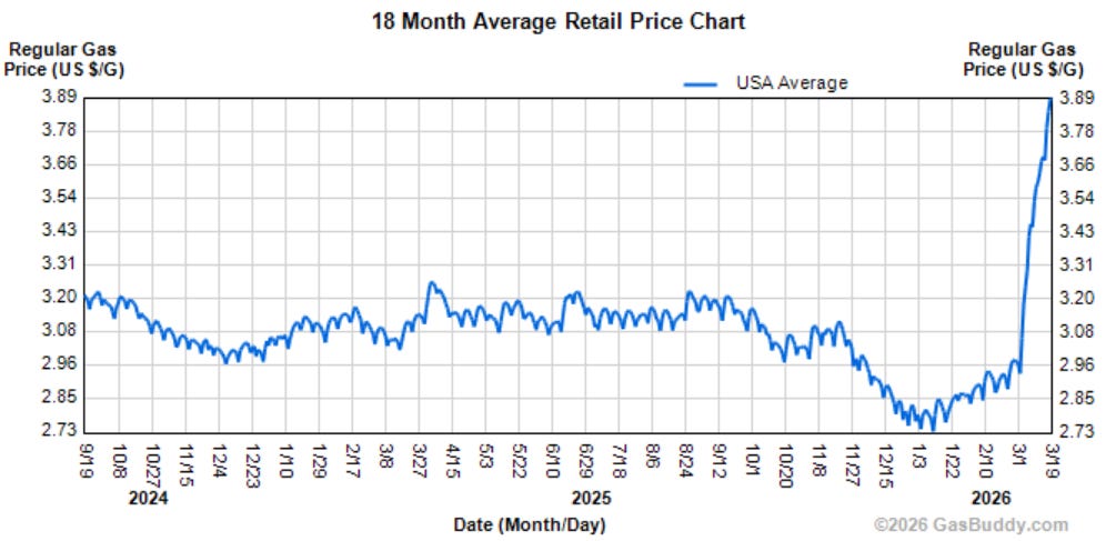 The War Must End NowTrump has had his fun. The cost of the war has become far too great, and it must end now.Morning everyone. There’s a lot going on but there is one essential story right now - our old, addled, Epstein desperate leader miscalculated; his illegal war is a disaster for America and the world; and it must end as soon as possible. The “win” now for Trump is him having the humility to end it, somehow, whatever are the words that flow from him that no one will pay attention to any way. The war has now officially spiraled out of control, as wars do; the damage being done to our global energy and food supplies has become earth-shatteringly dangerous; the cost to the economies of nations, and global stability, has become too dear. If this ridiculous war goes on much longer the costs will start to become incalculable; and it will because this one man, this historic, vainglorious fuck up, enabled by a corrupt Supreme Court and cowardly Republican Congressional leadership, imagined himself an Emperor and just went for it. Because it was a Friday, and he needed something to make himself feel STRONG and MIGHTY for things on the home front were not breaking his way. And so he went to war. And it went to shit, almost immediately. There is really only one thing that matters to the American people now - the war must end, and Trump must be reined in or leave office. For he is a dangerous man, perhaps the most dangerous in human history, and we must continue to rise up and demand our leaders fight to mitigate the extraordinary damage he is doing to America, and the world. I think our national discourse is not accurately portraying the threat to America and the world this war - and a completely out of control Trump - has become. As I’ve been writing here our economy was already headed towards recession and rising inflation prior to the war; the Pentagon is already requesting $200 billion more funding - $200 billion for three weeks of war; spiking oil, gas, and commodity prices are hurting consumers across the world and putting millions of small businesses and farmers at risk; equity prices continue to fall throughout the world, leaving all nations poorer; the costs of repairing the damaged Gulf energy infrastructure could easily be in the hundreds of billions. I could go on and on but simple the cost of all this is not worth whatever it is Bibi and Trump are doing to Iran. There is no possible justification for this, and the war must end. Here’s Brent crude futures this morning. Up and up and up: Here’s gas in the US today. Up $1.16 a gallon, 43%!!!!!, this year. Almost none of this price spike had yet shown up in all that terrible economic data we reviewed yesterday: Here’s that new inflation data we got yesterday. It’s scary data, all pre-war: And then there are the direct costs of the war to the American people - already at $200 billion and counting. Trump is just spending hundreds and hundreds of billions without Congressional authorization. It’s without question the greatest abuse of Presidential power in our history: Meanwhile Trump has becoming increasingly unstable, as has his regime. His utterances each day about the war are outrageously incoherent. MTG has become an outspoken opponent, a former cultist now challenging the cult; Noem fell; Bovino “retired"; Kent resigned in protest; Susie Wiles is leaving; Gabbard changed her story during the course of the day yesterday; Kennedy is being reined in; Bondi threw a temper tantrum last night; Hegseth’s wild, bloodthirsty pressers have become prime war crime trial evidence; and Trump is in process of being rebuffed by Senate Republicans on his rancid SAVE Act. The regime has begun to crack under the weight of their profound failure, soaring unpopularity, and clear betrayal of everything Trump promised in the election (No Wars, lower prices, etc). My overwhelming sense now is that Congressional Democrats have to accept that we are in a period of discountinuity. This moment is not like any one we’ve ever experienced. We need to fight him in new and more ambitious ways, take risks, rise to the moment. An example of how we need to play the game now is what Leader Jeffries and House Democrats did yesterday by launching a discharge petition to fund the parts of DHS not involved in the illegal, and illiberal, assault on our communities. They are leaning into the fight, not running from it: