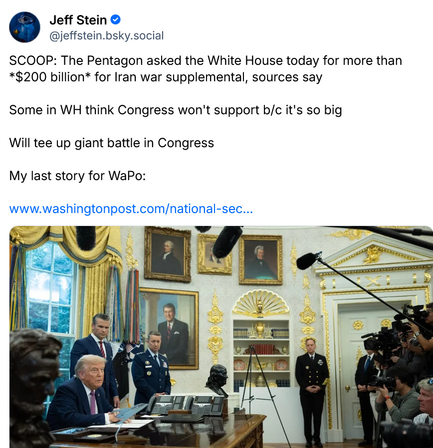 For the next big funding fight is going to be their outlandish request for at least $200 billion to fund the war, a war that was never authorized by Congress. Trump has spent at least $200 billion for this war, without authorization, while also doing tens of trillions of damage to the global economy. As we are doing with DHS/ICE, we must make very clear what it will take to get our vote for this funding. Here’s my working list: