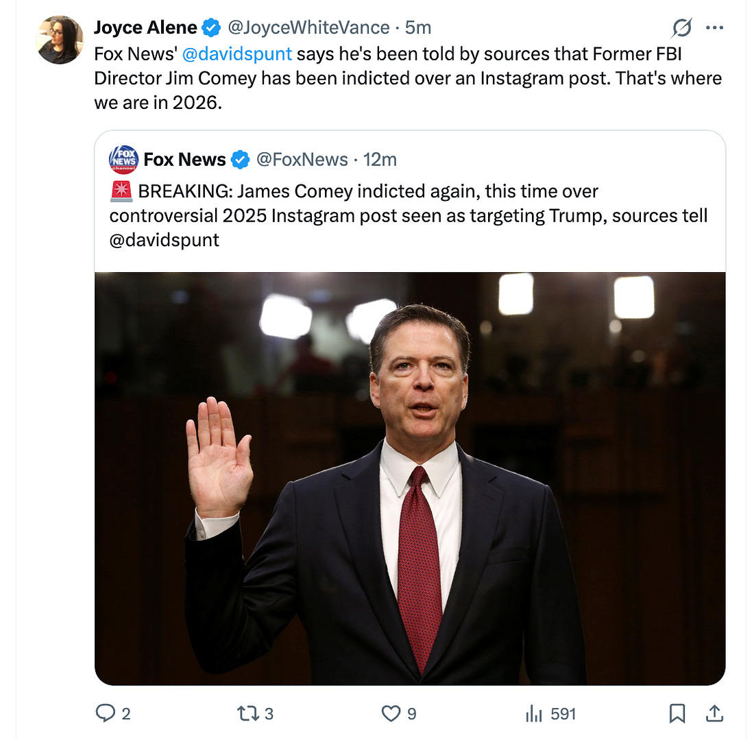 The charges make about as much sense as the theory that because the Southern Poverty Law Center was paying informants to provide information about hate groups, it was somehow supporting those groups. Here, the government will have to prove, beyond a reasonable doubt, that “86 47” conveys a physical threat against Trump, when anyone who has ever worked in a restaurant will tell you it means remove, as in to remove a sold-out item from the menu, or in this case, remove Donald Trump from office. Comey promptly apologized and removed his post when it was suggested that it might be construed as encouraging violence. Was it a smart post? I’ll leave that up to you. Was it criminal? That’s up to the courts, and perhaps ultimately, to a jury. In 2022, in Counterman v. Colorado, a 7-2 Supreme Court explained the “true threat” doctrine, which is the dividing line between pure political speech, an expression of dissatisfaction or even dislike of the current president that is protected by the First Amendment, and a true threat that is not, and can give rise to prosecution. Justice Kagan wrote the majority opinion. She was joined by the Chief Justice, as well as Justices Alito, Kavanaugh, and Jackson. Justice Sotomayor concurred in the judgment and was joined in parts by Justice Gorsuch. Justices Thomas and Barrett dissented. Without parsing the details of the decision, which is interesting enough for us to take up on a quieter news day, suffice it to say that the majority behind the decision cuts across ideological lines in a decisive fashion and sets up the contours of what the government will have to prove to convict Jim Comey. Under Counterman, the government must show that a defendant had some subjective understanding that his statement was a threat. “The State must show that the defendant consciously disregarded a substantial risk that his communications would be viewed as threatening violence.” True threats are “‘serious expression[s]’” conveying that a speaker means to ‘commit an act of unlawful violence.’” Comey’s post is at most ambiguous, and ambiguity doesn’t lend itself to proof of guilt beyond a reasonable doubt. Comey is a polarizing figure. Nonetheless, good luck convincing a jury—every single member of it—that seashells are a physical threat against the president, made by a man who devoted his entire life to enforcing the rule of law. Federal prosecutors aren’t supposed to indict a case unless they believe they have sufficient evidence to convict and to be affirmed on appeal. Given the shaky ground prosecutors are on here, it’s difficult to believe they met that standard. Nonetheless, the U.S. Attorney in the Eastern District of North Carolina took the case to a grand jury, and they returned an indictment. Trump has encouraged violence far more directly than Comey’s Instagram post could be perceived as doing, as far back as his 2016 campaign, where he encouraged his crowds to be rough with reporters and mused about punching a protester in the face. “Knock the crap out of them,” he told the crowd at one of his rallies, referring to protesters. There was little criticism from his own party, let alone an indictment. Trump famously told the Proud Boys to “stand back and stand by” at a 2020 presidential debate ahead of their involvement in January 6. Ahead of his indictment in Manhattan, Trump posted an image of himself holding a baseball bat, threatening Manhattan DA Alvin Bragg, who was in a hands-up position, and spent the day attacking Bragg on Truth Social for pursuing an investigation into Trump’s payments to porn star Stormy Daniels. Then, in September of 2024, Trump attacked General Mark Milley on Truth Social. He called the General a “Woke train wreck” and concluded that Milley’s call with Chinese counterparts, trying to reassure them the U.S. wasn’t going to attack them, was “an act so egregious that, in times gone by, the punishment would have been DEATH!” In November of 2024, Trump said Liz Cheney should face gunfire. She called it a death threat. And of course, there was the March 2024 incident where Trump posted a video depicting Joe Biden kidnapped, zip-tied, and in the back of a pickup truck driving down the road. All of those comments were made in a volatile environment where some of Trump’s most unpredictable followers showed signs of looking to his social media posts as suggestions, if not orders. Prosecuting Comey over seashells feels both selective and vindictive in light of all of that conduct, which Trump has never been so much as officially reprimanded for. Today, at DOJ’s press conference announcing the Comey indictment, Todd Blanche said that what Comey did “is the kind of conduct we will NEVER tolerate and we will ALWAYS investigate and prosecute.” But that doesn’t seem to be the case, even if one viewed Comey’s seashells as on par with the president’s more directly threatening language. Comey will be arraigned and the case will proceed. Blanche seemed to waffle today on the issue of whether Comey would be arrested or permitted to appear with his attorney, as he did in his first case, suggesting the grand jury had decided to arrest him. Typically, those calls are made by the U.S. Attorney’s office. In a video released Tuesday night, Comey said he was innocent and unafraid. “Let’s go,” he concluded. Finally, from our friends at The Bulwark: the State Department is preparing to emblazon U.S. passports with Donald Trump’s face. They reported that the inside cover of passports would feature a “scowling” Trump, superimposed over the Declaration of Independence, with his signature in gold. Not the Onion, folks. Read the full piece here. Another long and troubling day. Make sure you stay informed. We’re in this together, Joyce You're currently a free subscriber to Civil Discourse with Joyce Vance . For the full experience, upgrade your subscription.