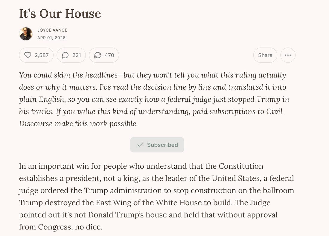 Tell me who you think wrote this: “‘The National Trust for Historic Preservation’ is a beautiful name, but even their name is FAKE because when they add the words ‘in the United States’ to the National Trust for Historic Preservation, it makes it sound like a Governmental Agency, which it is not. In fact, the United States refused to continue funding it in 2005 because they strongly disagreed with their mission and objectives. They are very bad for our Country.” I know who it sounds like in my head. I can hear Donald Trump’s voice. But in fact, it’s the lead paragraph in a motion filed by the Justice Department Tuesday morning, in the lawsuit over Trump’s unauthorized demolition of the White House’s East Wing so he could build his ballroom. The lawsuit alleges violations of environmental and historic preservation laws, seeking to stop construction. We’ve been discussing it as it progresses. But in the wake of Saturday night’s incident at the White House Correspondents’ Dinner, DOJ filed a remarkable statement of position in the case this morning, without a request from the judge. It was filed over the acting Attorney General’s name and signed by the Associate Attorney General (who, while the acting AG is seeking the nomination for the permanent position, is reportedly fighting for his job). The pleading, which is titled “DEFENDANTS’ RULE 62.1 MOTION FOR AN INDICATIVE RULING DISSOLVING THE COURT’S INJUNCTION”—a request that the court tip its hand on how it will rule in the future—goes on to explain that despite being asked by the military not to sue because of the “Top Secret nature of the important facility being built,” the plaintiffs went ahead. Why would they do such a thing? The motion explains: “This did not deter them because they suffer from Trump Derangement Syndrome, commonly referred to as TDS, as noted by Democrat Senator John Fetterman, of Pennsylvania, and are represented by the lawyer for Barack Hussein Obama, Gregory Craig.” The upper echelons of the Justice Department have truly become the president’s law firm. You know what’s coming next. The motion delivers it: “With such a facility, it would have been impossible for an attack like that which took place last Saturday evening in D.C.” It continues, “The Secret Service fortunately neutralized the assassin before he could reach the ballroom. However, Saturday’s narrow miss—which marks the third assassination attempt on President Trump since 2024—confirms what should have already been obvious: Presidents need a secure space for large events, that currently does not exist in Washington, D.C., and this Court’s injunction stalling this Project cannot defensibly continue, for the sake of the safety of President Trump, future Presidents, and their families, Cabinets, and staff.” That might work—if presidents never traveled out of the ballroom. The motion maintains that “This Project will ensure that events like the horrific attack on Saturday night do not happen again.” Perhaps the president should consider reforming gun laws if he hopes for that outcome, because building a ballroom isn’t going to get him there. The motion continues, replete with excessive capitalization, and tells the court that “this weekend makes clear why this Court’s injunction must be dissolved ‘immediately.’” The injunction that partially stops work on the project is on appeal, which halts the court’s jurisdiction, which is why the White House is asking for an “indicative” ruling. But instead of making legal arguments, they resort to insulting the court’s prior ruling, writing, “This Court should never have enjoined this Project, but now, after the Saturday night attempted assassination, which could have never taken place in the new facility, reasonable minds can no longer differ — The injunction must be dissolved. This Court should immediately issue an indicative ruling that it will dissolve the injunction, and put an end to this frivolous lawsuit, which greatly endangers the lives of all Presidents, current and future.” This president, who seeks the power of a unitary executive, a king in everything but name, wants to simply tell a federal judge what to do and make it so, using Saturday night as a convenient hook. And tellingly, no one at the Justice Department told him no. No one stood up for principle or the rule of law. I had expected to devote the entirety of this post to the motion, but it was not to be due to other developments. You can read the motion in full here, but read on first, because there is other news. In what has to be the ultimate small world story, former FBI Director Jim Comey’s daughter, Maurene, was the federal prosecutor who handled the Epstein case and obtained the conviction of Ghislaine Maxwell. Her performance as a prosecutor was “exemplary” until she was fired, according to the judge who is handling her lawsuit challenging her removal. Maurene Comey sued, arguing that she was improperly removed “solely or substantially because her father is former FBI Director James B. Comey, or because of her perceived political affiliation and beliefs, or both.” The Trump administration wanted the case dismissed, maintaining she couldn’t bring suit in federal court, but today, federal District Judge Jesse M. Furman in the Southern District of New York held that she could proceed. That decision may spill over and encourage other fired federal employees, because her case will be heard by a federal judge, not an administrative agency, the Merit Systems Protection Board, which itself has been impacted by Trump firings. But, of course, Maurene wasn’t the only Comey in the news today, because her father was indicted—for the second time—by the Justice Department, this time in a case that skates on even thinner ice than the one that was dismissed late last year. The indictment is about this now-deleted Instagram post. That’s alle