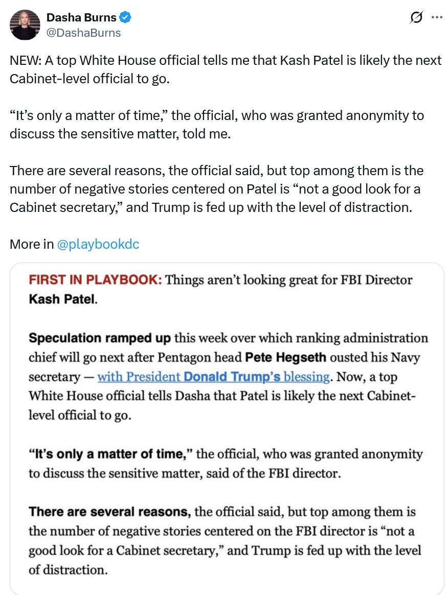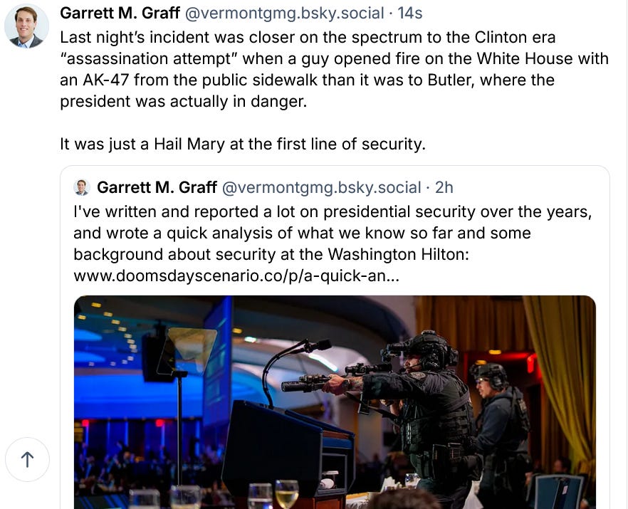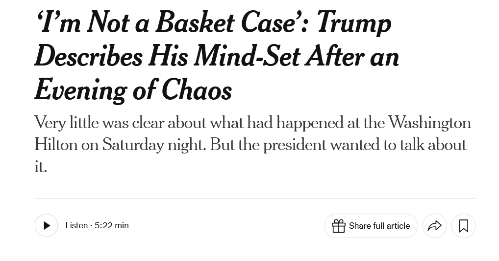 Greetings everyone. I am grateful that no one was seriously injured at the White House Correspondents’ Dinner last night. While I have attended the dinner in years’ past thankfully I was not there last night. As we will learn more about what happened and the gunman in the coming days I’m going slow today - while acknowledging that we won’t be able to trust any of the information we'll be getting from the White House and the ridiculous people people Trump has put in charge of the Department of Justice and the FBI. In fact this is what people heading to the dinner last night were reading about FBI Director Kash Patel: Here’s an actual headline on The New York Times website right now: Here are the two best things I’ve read about last night: