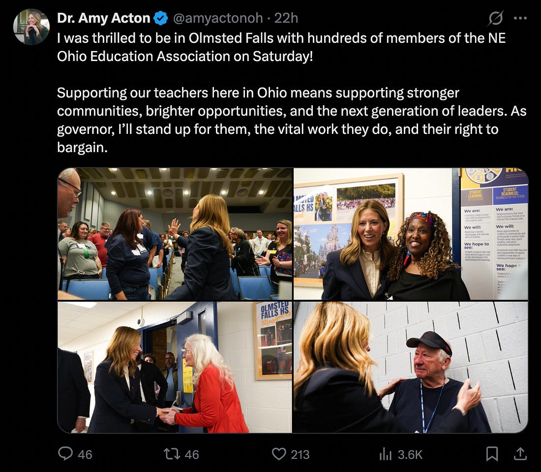 Almost every statewide poll taken in recent weeks, including this one, has both races within margin of error. Some have shown the Dems ahead, others the Rs. It shows how far things have shifted across the country when Democrats have a legit shot of winning both these races in a state Trump won by 12 points in 2024. One reason why is that not only is Trump under water in this poll, but Ohio Governor Mike DeWine is very unpopular, and now possibly the most unpopular governor in the country. Folks have grown tired of the corruption and extremism of a Republican Party in Ohio that has been in power, and been far too malevolent, for far too long. Our Winning Ohio campaign splits contributions evenly among our Senate candidate Sherrod Brown, the gubernatorial ticket of Amy Acton and David Pepper, and the Ohio Democratic Party. Please consider donating today to help turn this critical state blue in 2026, and help us flip the Senate. This remarkable community has already poured $123,000 into Winning Ohio, and we are well on our way to hit our $250,000 June 30th goal! We began our deep dive into battleground Ohio with a recent interview with our old friend, David Pepper, now Amy Acton’s running mate. You will learn much more today from Chair Clyde, who provides us with a terrific overview of their opportunities this year. Look for interviews in the coming days with Sherrod Brown and Amy Acton too. Yes, Ohio is in play, my friends. Let’s dive in and do what we can to make this one of our big success stories this year. Keep working hard all. We have a country to save, and an election to win, together! - Simon Bio - Kathleen Clyde, Chair, Ohio Democratic PartyKathleen Clyde is a proven leader and lifelong fighter for Ohio Democrats. Before becoming Chair of the Ohio Democratic Party, Kathleen served as Senior Director of the RISE Together Innovation Institute, a Columbus-based nonprofit focused on advancing racial and economic justice. Kathleen served in the Ohio House of Representatives from 2010 to 2018, representing a competitive district in Portage County for four terms. She then served as Portage County Commissioner from 2018 to 2020 and ran for Ohio Secretary of State in 2018, raising over $3.15 million and outperforming the top of the Democratic ticket. In 2022, she stepped up to run for a deep-red Statehouse seat and came within 2.4 points of unseating the incumbent in a district Governor DeWine won by 24 points. From her early days as a staffer on the 2004 Kerry campaign to co-chairing President Biden’s 2020 Ohio campaign—where she was recognized as one of the DNC’s “Rising Stars”—Kathleen has built deep relationships across the state and nationally. She has raised over $4 million across her own campaigns, breaking fundraising records and earning the trust of labor unions, grassroots activists, and major donors. As an operative, candidate, and elected official, Kathleen has spent her entire career on Ohio’s political frontlines without compromising on the progressive values that center working families and diverse communities. She’s ready to lead with integrity, strategy, and full-time dedication to building a strong, inclusive, and winning Ohio Democratic Party. Learn more about Chair Clyde here. You're currently a free subscriber to Hopium Chronicles By Simon Rosenberg. For the full experience, upgrade your subscription.