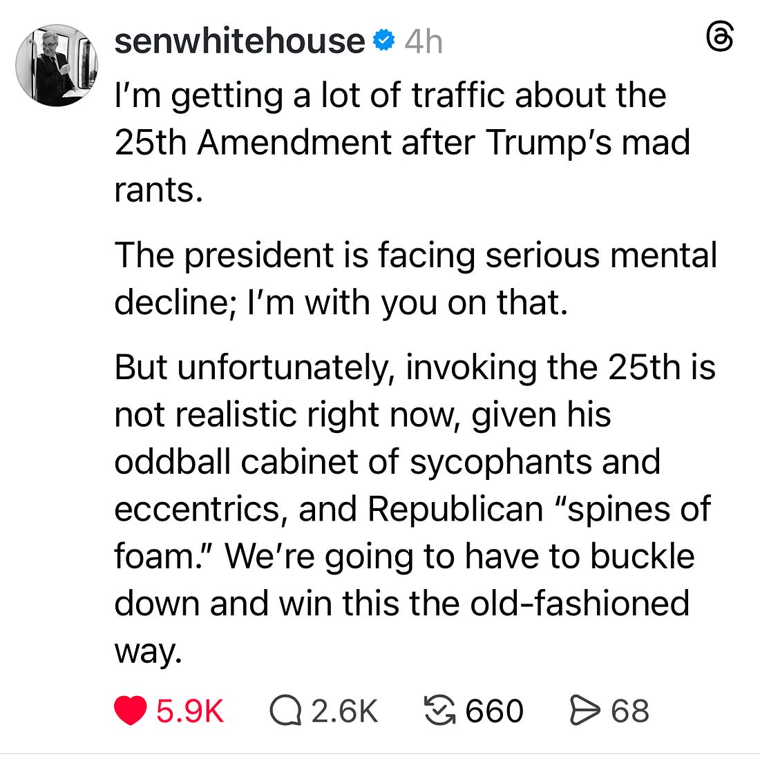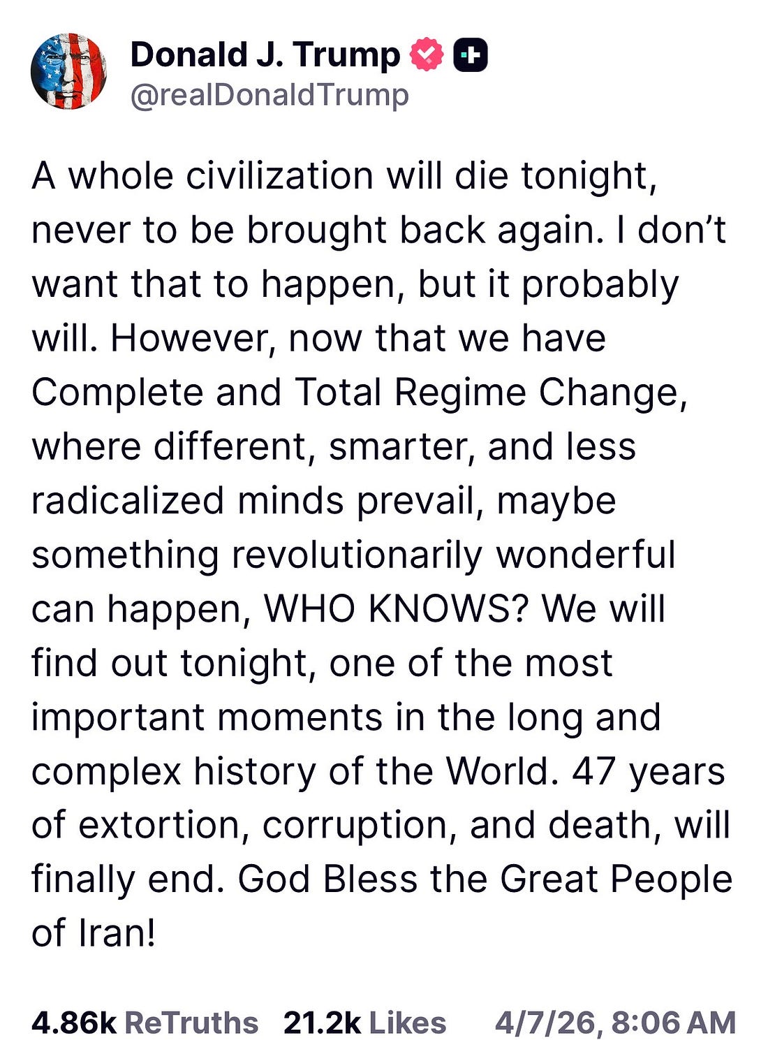 Tuesday morning, in a social media post, the President of the United States signaled his intent to violate the rules of war, which prohibit targeting civilians. He didn’t speak of attacking military targets. Instead, he threatened to wipe out an entire people, an entire civilization. It “will die tonight,” Trump wrote. As former Iraq War Commander, retired Major General Paul D. Eaton wrote later in the day, “Wiping out an entire civilization is the definition of genocide. Any order given to that effect must be refused by every service member up and down the chain — period.” The Geneva Conventions, to which we are a signatory along with 196 other nation-states, form the basis for international humanitarian law, the goal of which is “to maintain some humanity in armed conflicts, saving lives and reducing suffering.” That law is binding, and violations can be investigated and prosecuted as war crimes. Trump breaking the law, even bragging about it, is nothing new. But this time, there are serious consequences, outside of his control, that he could come up against. On Tuesday afternoon, I flew home, spending several hours in the air with no Wi-Fi. Not even texts got through. Trump’s Iran deadline was approaching. And I realized that there were real reasons to fear that the world would be different by the time we landed. That this no-guardrails presidency could have taken us to an entirely predictable endpoint. Instead, we got a reprieve of sorts. A ceasefire. (Albeit, as experts have noted, on terms favorable to Iran, which has demonstrated its ability to survive a joint attack by the U.S. and Israel and made clear its ability to use the Strait of Hormuz as a bargaining chip. Iran’s Islamic fundamentalist regime has not been toppled. The status of its enriched uranium is unclear.) But really, how many more wake-up calls can the country, can Trump’s party ignore? How many more people, in our own military, in countries we attack, American citizens protesting peacefully on our own streets, people abroad who rely on American programs that are suddenly withdrawn, will die? How much more of this do we have to tolerate so MAGA can continue to worship its idol, who rules from an altar built of greed? The Founding Fathers created our divided branches, rule of law-based system of government, because they understood that men were not angels. That’s why Donald Trump’s contempt for the rule of law is so alarming. Contempt for the rule of law is contempt for our way of life. Preserving the rule of law means we don’t have a king; it holds corruption at bay, and it forbids a president from running the country like it’s the mob. And so, Trump’s distaste for it is a distaste for democracy itself, and that is something the country has never fully reckoned with. Trump’s party certainly hasn’t. At his core, he is anti-democratic. Trump has never been afraid to express any of it, certainly not his belief that he is above the law. “When you’re a star, they let you do it,” he famously said in the Access Hollywood tape, and his wife explained it away as locker room talk. We have always known who he is because he does not pretend to be otherwise. “I could stand in the middle of Fifth Avenue and shoot somebody, and I wouldn't lose any voters,” he told us. No one should be surprised that the enfant terrible is threatening to take down an entire civilization. The law is clear, but what is the law to Trump? It has never mattered. He doesn’t care about targeting civilians or civilian infrastructure. He’s not concerned with the consequences; he’s promised them—the destruction of a civilization. It’s not new. It’s just an extension of what the Republican Party has let him get away with up until now, utter disregard for the law, as it applies to him. To all the people who were willing to ignore Trump’s flaws for whatever reason—self interest, adjacency to power, a desire to be seen as tough guy— this is the moment to acknowledge that you were wrong and to try and make what amends you can. It’s time to back away from the edge of the cliff that is the destruction of a civilian population. Really, it’s past time, but there is still some time left. Members of the military who are serving in harm's way, at the whim of this petty little man, deserve it. They should not remain unprotected because Republicans in Congress can’t muster the grit to do their jobs. It’s time to look in the mirror and decide whether we still like what we see. Can we live with this? Can we live with what our children and our grandchildren will think about us? That’s why so many of us have been working so hard to restore this democracy. Congress, which hasn’t done its job, needs to step up, and that largely means members of the president’s party. Members of the military, and especially leaders, take an oath to uphold the Constitution. Their oath requires that they not obey illegal orders. That was the whole point of the video six members of Congress made, reminding people serving in the military of their duty. Today, Michigan Democratic Senator Elissa Slotkin warned that if Trump’s threat against Iran was carried out, it would “violate the law of armed conflict as laid out in the Geneva Conventions.” It’s wrong for Congress to abandon the military when it needs protection from a president who was on the verge of doing and ordering the unthinkable, and could easily go there again. Enough. We are at war in Iran while Congress is out of session—and out of town. The war started on February 28, 38 days ago. The War Powers Act gives the president 90 days to withdraw deployed troops absent a Congressional authorization of the use of military force—the withdrawal must start at the 60 day mark and be complete by day 90. Congress should be present. Congress should act. “A whole civilization will die tonight, never to be brought back again.” Civilians. Human beings. Writing f