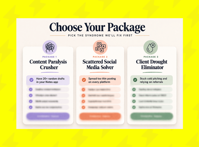 So a consultant could create packages aimed at labeling and solving specific problems, like Content Paralysis Crusher, Scattered Social Media Solver, and Client Drought Eliminator.